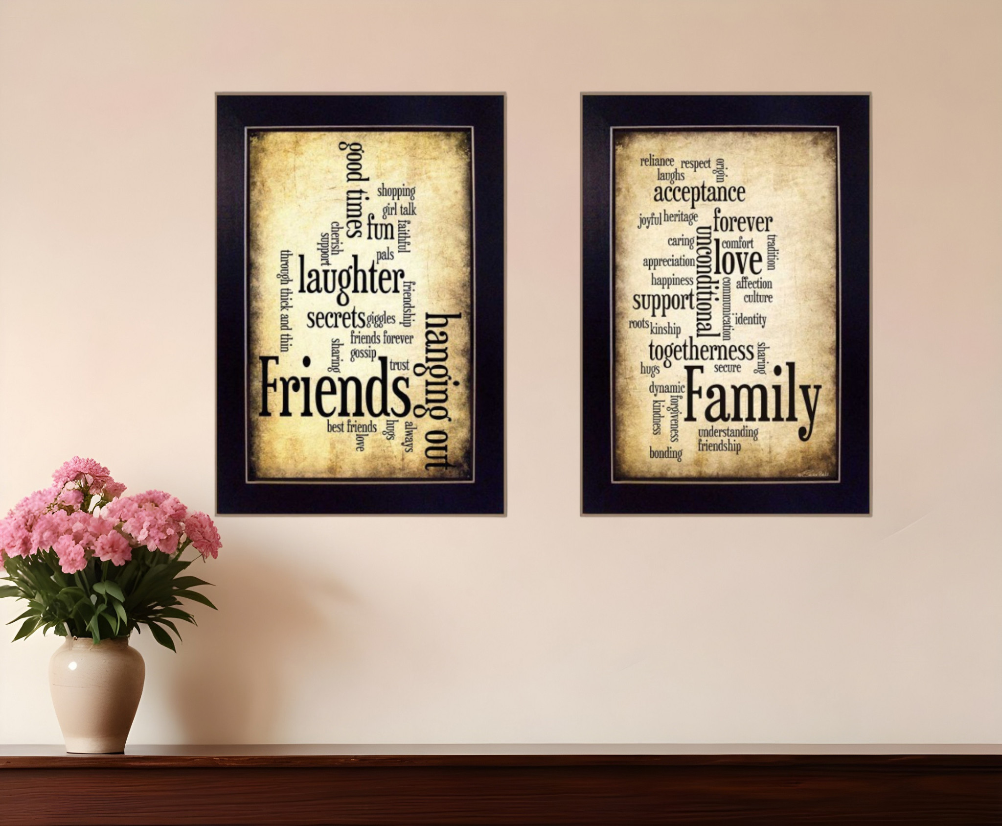 Add an air of fashion to your room and rejuvenate the space with this set of two friends and family black framed print wall art. This print is a visual artistic expression that allows you to decorate your space in style. Reproduced for you on paper, this hanging decorative accent will be a trendy and fashionable way to dress your walls. Adding this hanging wall art to your space to make your room feel more finished and attractive. Instantly liven up your space with this art that brings color and dimension to your walls. 14-inch H x 20-inch W x 1.5-inch D