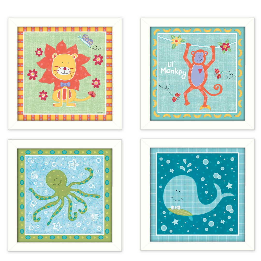 This set of four childrens room white framed wall art will add a beautiful decorative accent to your decor. Bring a little bit of tropical sea life indoors with this good looking whale art. This block print is a way to express your artistic style and add some fashion to your walls. Reproduced for you on paper, this hanging decorative accent will be a trendy and fashionable way to dress your walls. Adding this hanging wall art to your space to make your room feel more finished and attractive. Utilize this opportunity to create a focal point in the room with this fabulous wall decor option. 14.00-inch h x 28.00-inch w x 1.50-inch d.