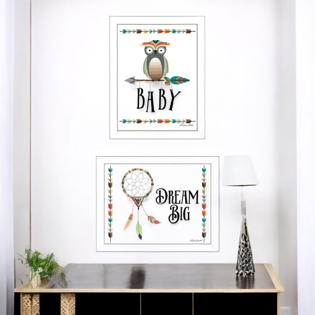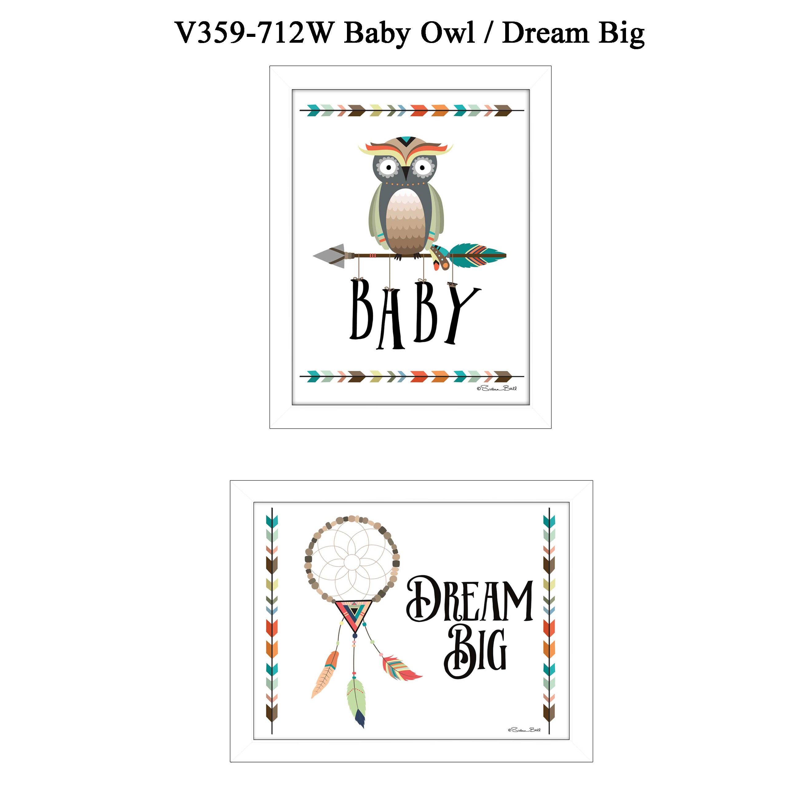 Bring some sizzle to your space with this eye-catching set of three baby owl or dream big 2 white framed print wall art. Update your walls with this woodland animal decor. This block print is a way to express your artistic style and add some fashion to your walls. Reproduced for you on paper, this hanging decorative accent will be a trendy and fashionable way to dress your walls. Adding this hanging wall art to your space to make your room feel more finished and attractive. Utilize this opportunity to create a focal point in the room with this fabulous wall decor option. 14-inch h x 18-inch w x 1-inch d.