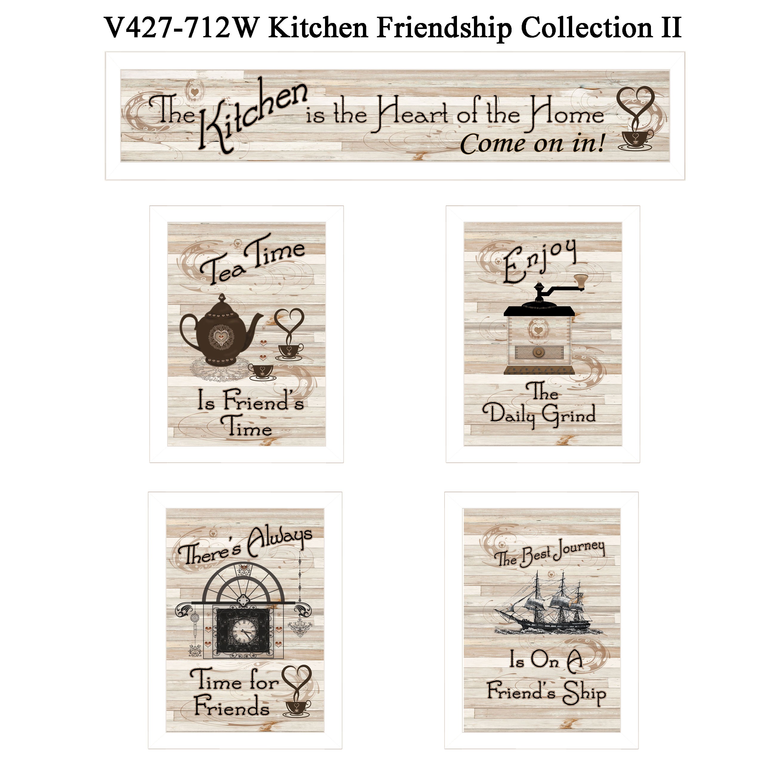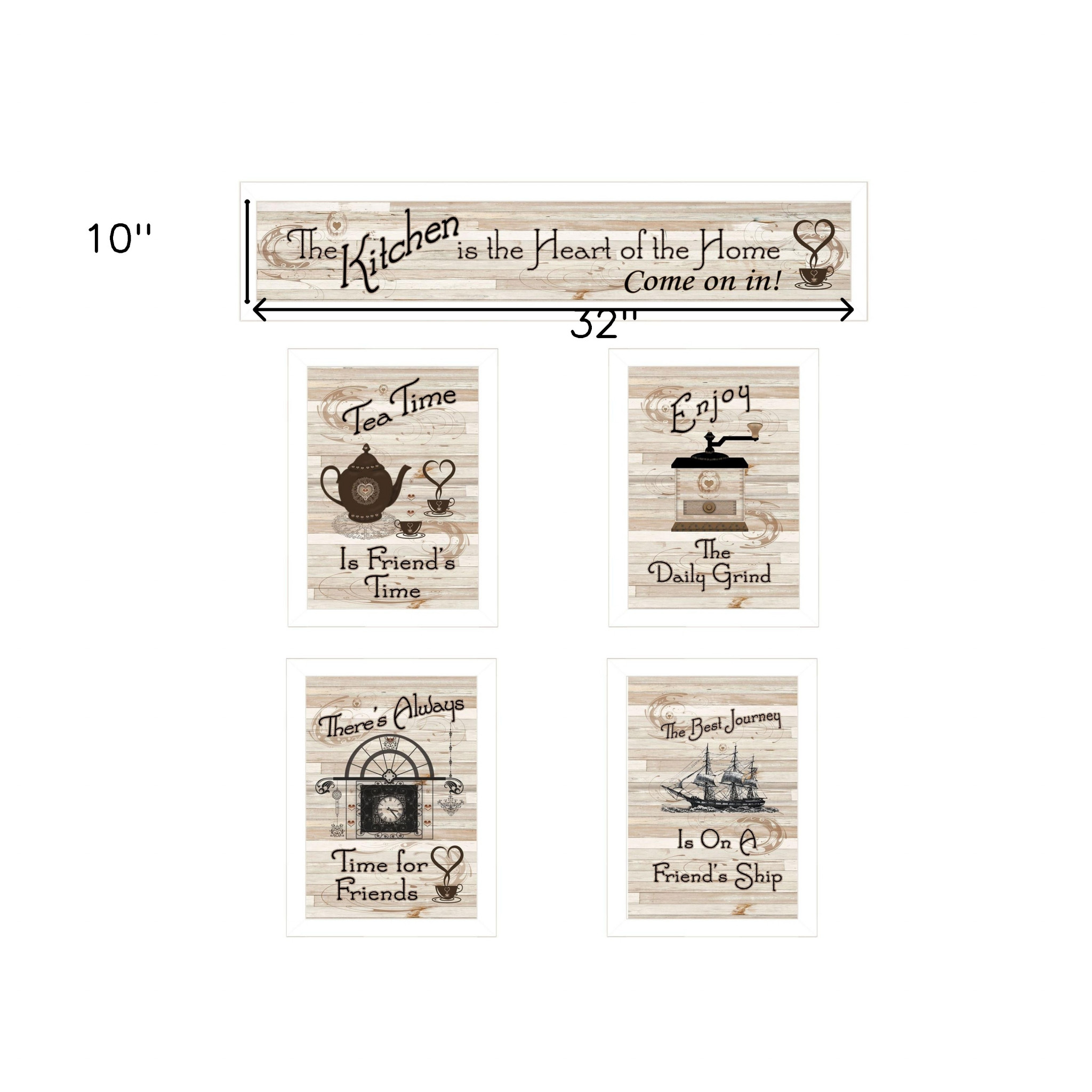 The set of five kitchen friendship collection ii 4 white framed print kitchen wall art is the perfect decorative accessory for your home. This print is a visual artistic expression that allows you to decorate your space in style. Reproduced for you on paper, this hanging decorative accent will be a trendy and fashionable way to dress your walls. Adding this hanging wall art to your space to make your room feel more finished and attractive. Instantly liven up your space with this art that brings color and dimension to your walls. 10-inch H x 32-inch W x 1-inch D