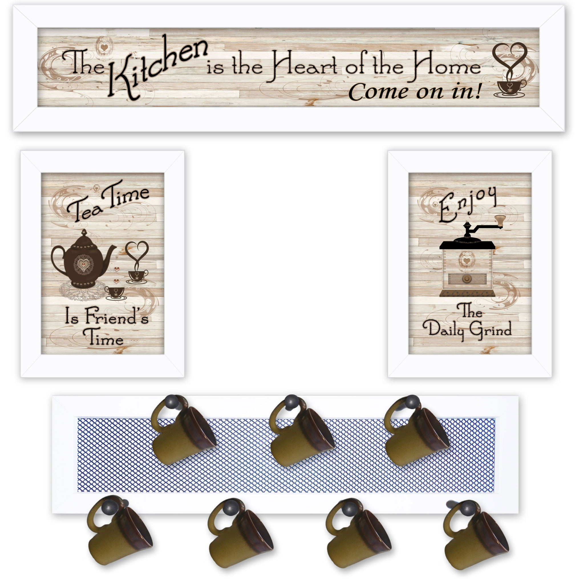 Bring some sizzle to your space with this eye-catching set of four kitchen collection iv with seven peg mug rack 4 white framed print kitchen wall art. This print is a visual artistic expression that allows you to decorate your space in style. Reproduced for you on paper, this hanging decorative accent will be a trendy and fashionable way to dress your walls. Adding this hanging wall art to your space to make your room feel more finished and attractive. Utilize this opportunity to create a focal point in the room with this fabulous wall decor option. 10-inch H x 32-inch W x 3-inch D