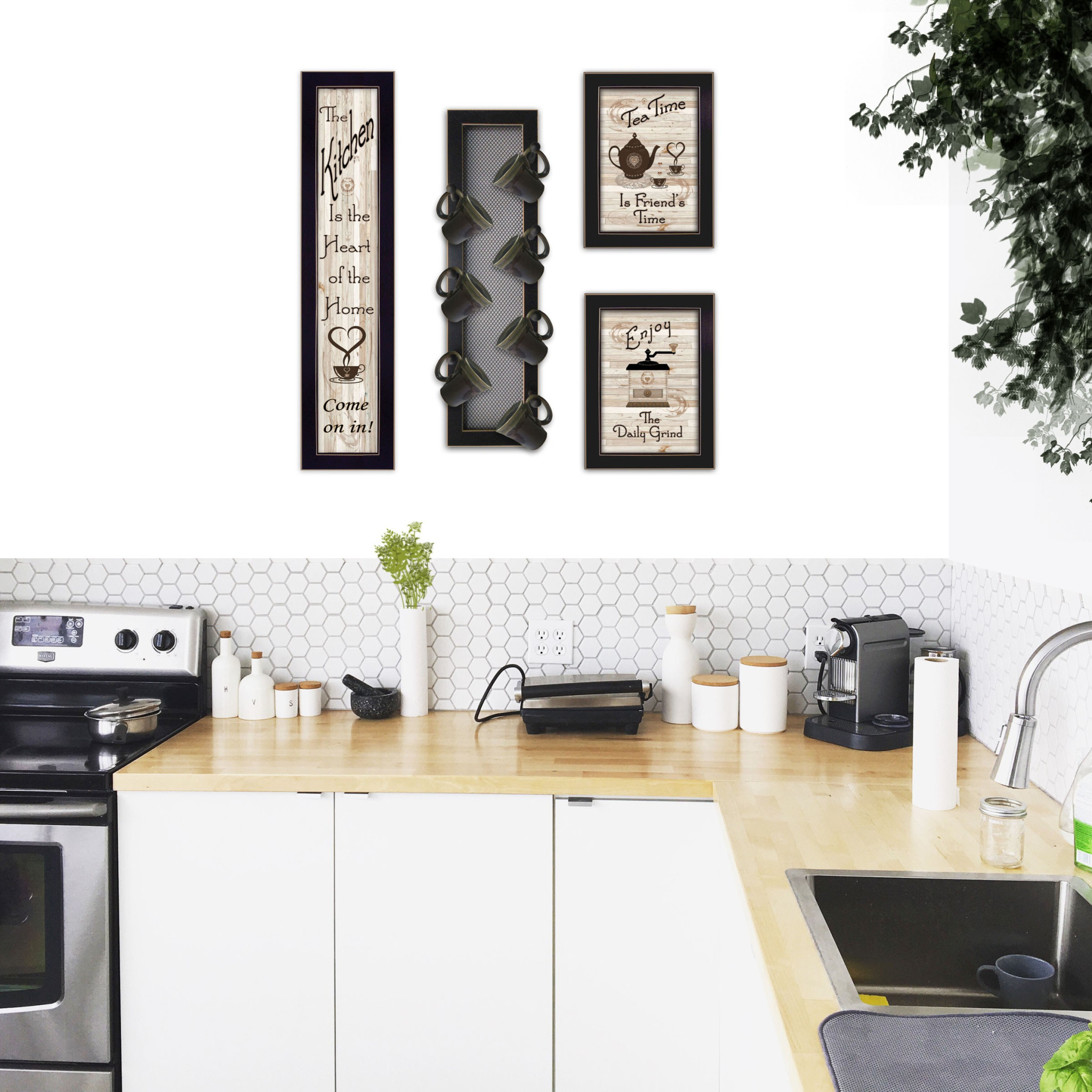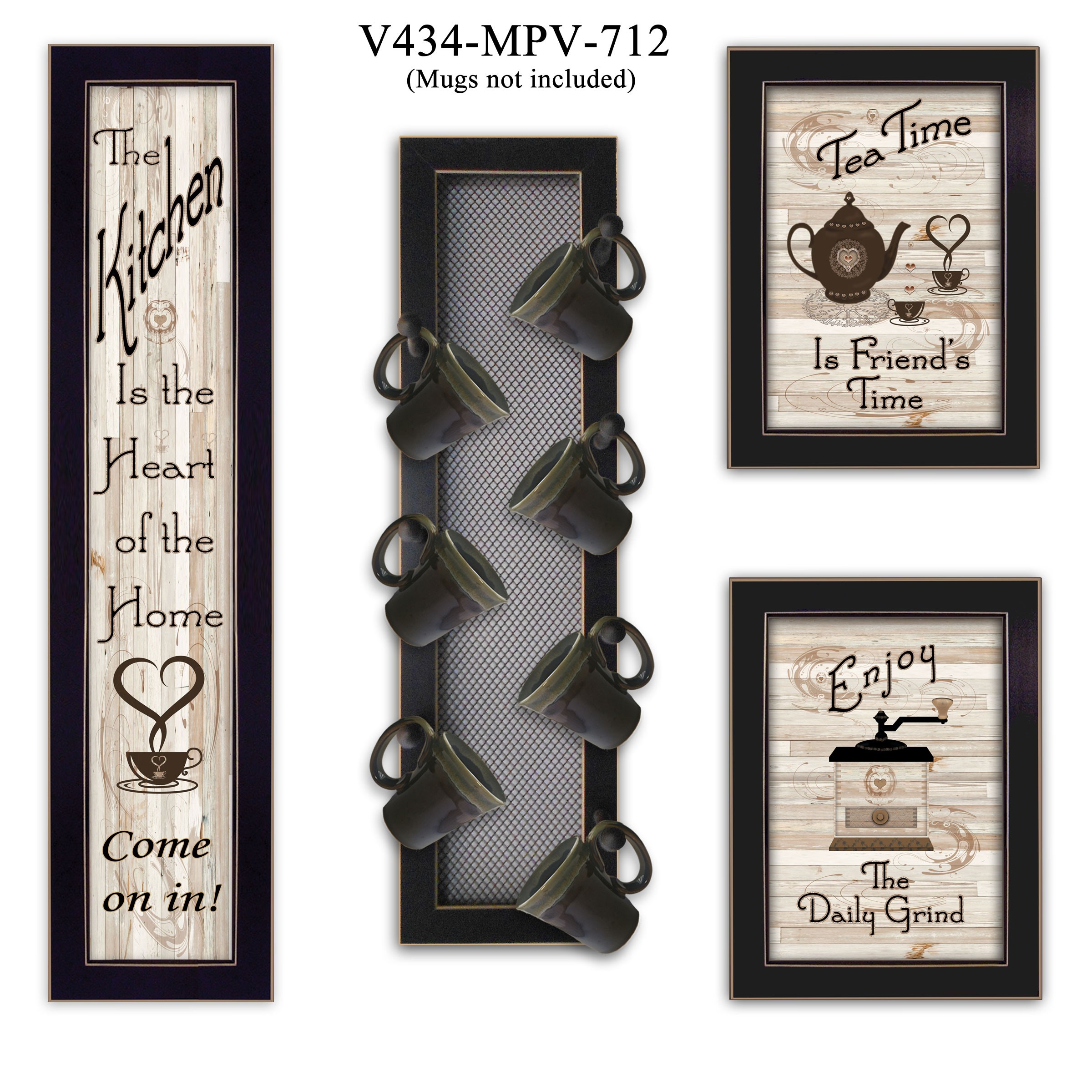 Bring some sizzle to your space with this eye-catching set of four kitchen collection v with seven peg mug rack 3 black framed print kitchen wall art. This print is a visual artistic expression that allows you to decorate your space in style. Reproduced for you on paper, this hanging decorative accent will be a trendy and fashionable way to dress your walls. Adding this hanging wall art to your space to make your room feel more finished and attractive. Instantly liven up your space with this art that brings color and dimension to your walls. 10-inch H x 32-inch W x 3-inch D