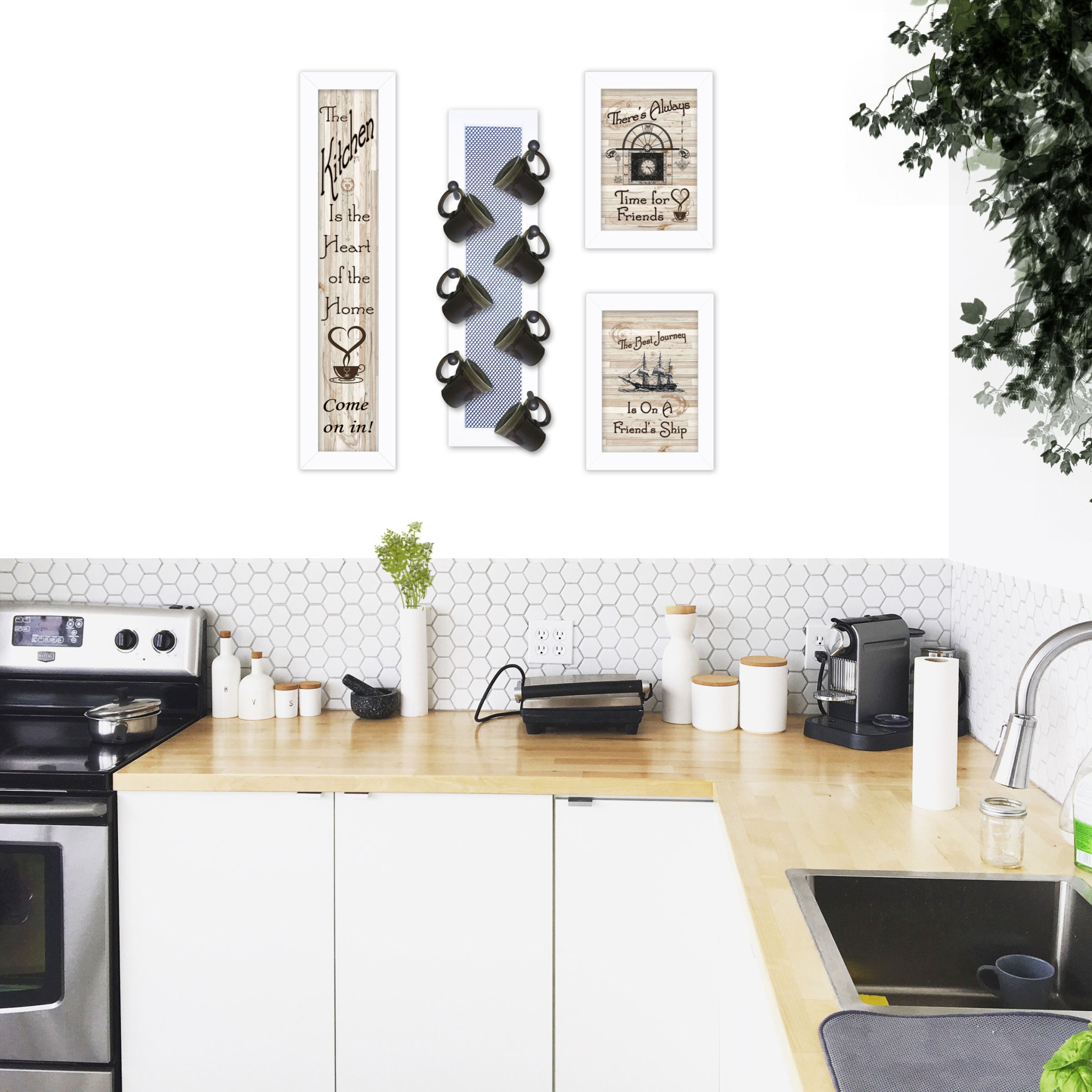 This set of four kitchen collection vii with seven peg mug rack 4 white framed print kitchen wall art will add a beautiful decorative accent to your decor. This print is a visual artistic expression that allows you to decorate your space in style. Reproduced for you on paper, this hanging decorative accent will be a trendy and fashionable way to dress your walls. Hang on your wall to add some up to date fashion and decoration. Instantly liven up your space with this art that brings color and dimension to your walls. 32-inch H x 10-inch W x 3-inch D