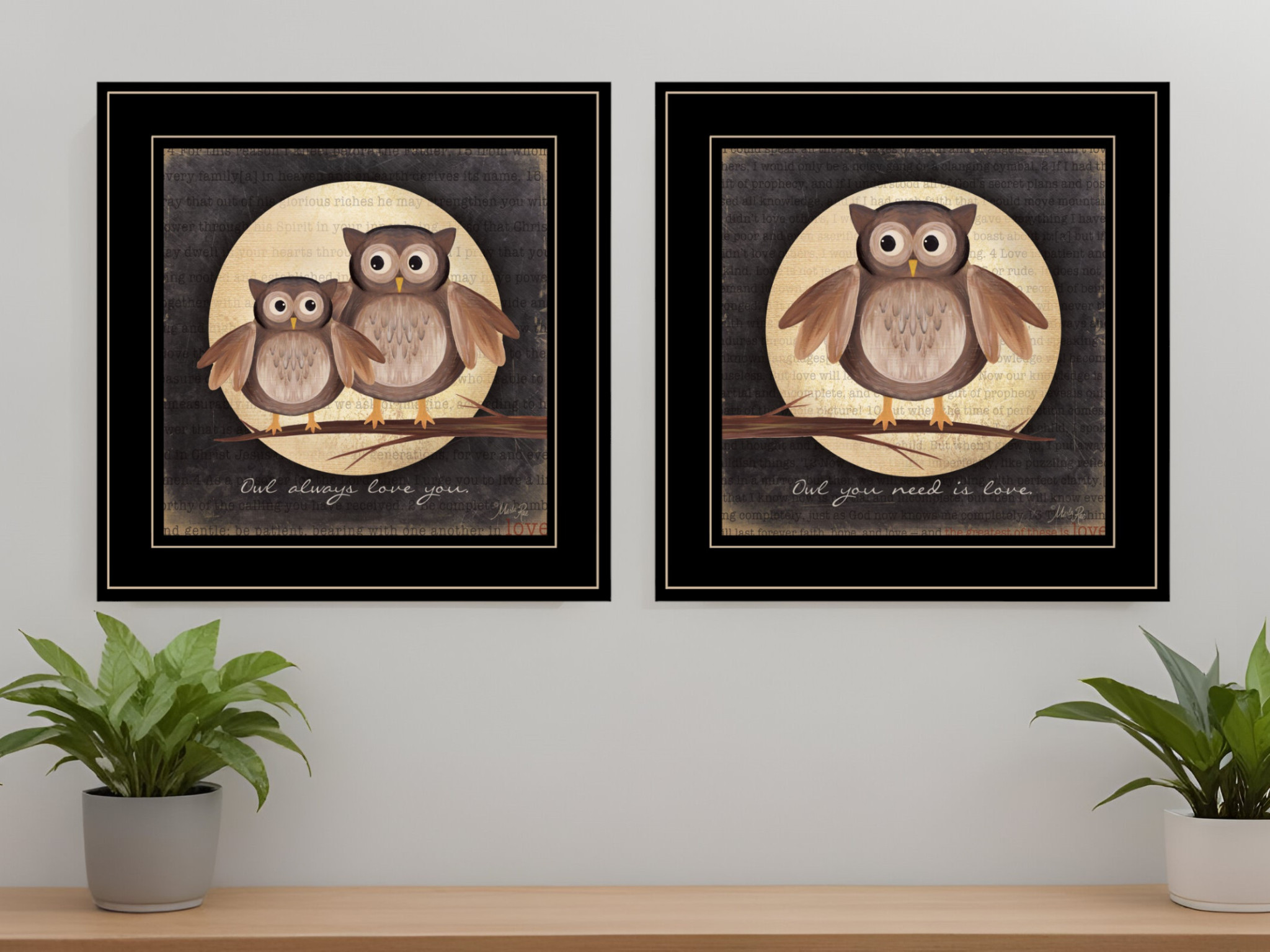 Bring some sizzle to your space with this eye-catching set of two owl always love and need you 2 black framed print wall art. Update your walls with this woodland animal decor. This print is a visual artistic expression that allows you to decorate your space in style. Reproduced for you on paper, this hanging decorative accent will be a trendy and fashionable way to dress your walls. Hang on your wall to add some up to date fashion and decoration. Utilize this opportunity to create a focal point in the room with this fabulous wall decor option. 15-inch H x 15-inch W x 1-inch D