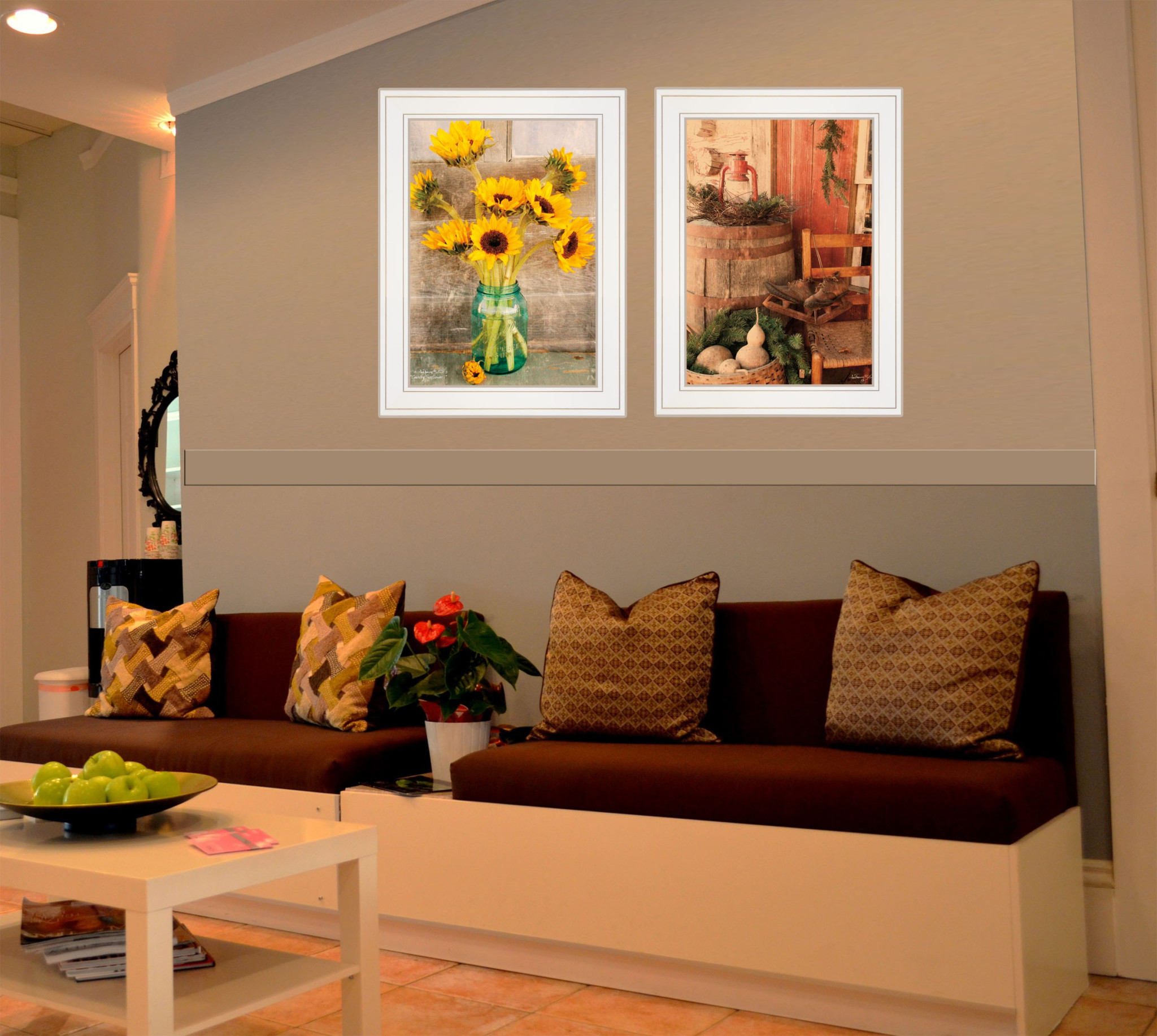The set of two vintage country and sunflowers 1 white framed print wall art is the perfect decorative accessory for your home. This print is a visual artistic expression that allows you to decorate your space in style. Reproduced for you on paper, this hanging decorative accent will be a trendy and fashionable way to dress your walls. Hang on your wall to add some up to date fashion and decoration. Instantly liven up your space with this art that brings color and dimension to your walls. 15-inch H x 19-inch W x 1-inch D