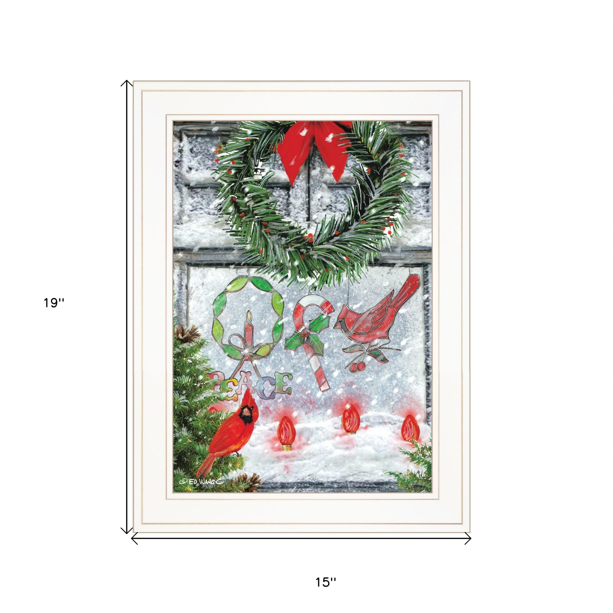 Add some christmas cheer to your space with this christmas peace 1 white framed print wall art. This unique and novel shaped art will bring some dimension and artistic design to your wall. This print is a visual artistic expression that allows you to decorate your space in style. Reproduced for you on paper, this hanging decorative accent will be a trendy and fashionable way to dress your walls. Hang on your wall to add some up to date fashion and decoration. Instantly liven up your space with this art that brings color and dimension to your walls. 19-inch H x 15-inch W x 1-inch D