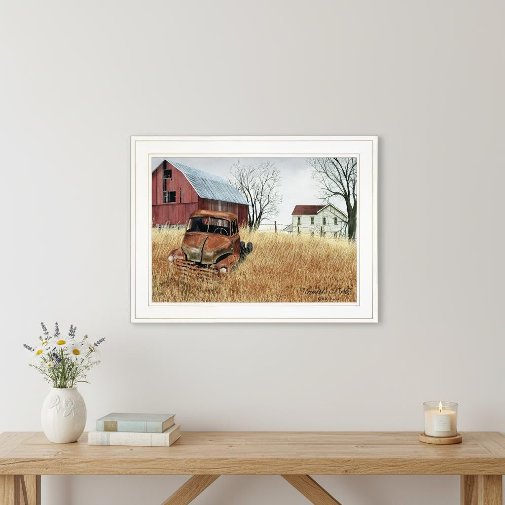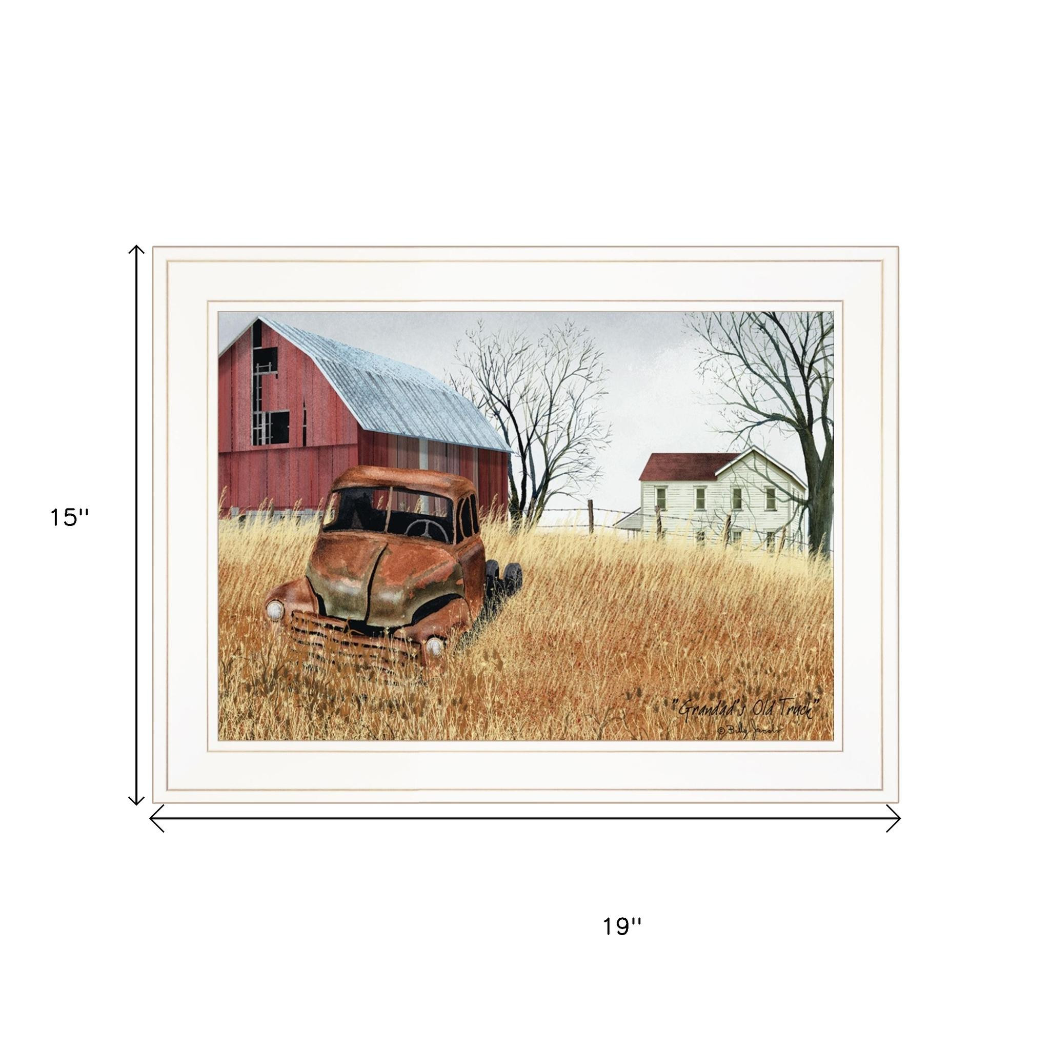 Unique and decorative, this granddads old truck 1 white framed print wall art will leave a lasting impression. This print is a visual artistic expression that allows you to decorate your space in style. Reproduced for you on paper, this hanging decorative accent will be a trendy and fashionable way to dress your walls. Hang on your wall to add some up to date fashion and decoration. Instantly liven up your space with this art that brings color and dimension to your walls. 15" H x 19" W x 1" D