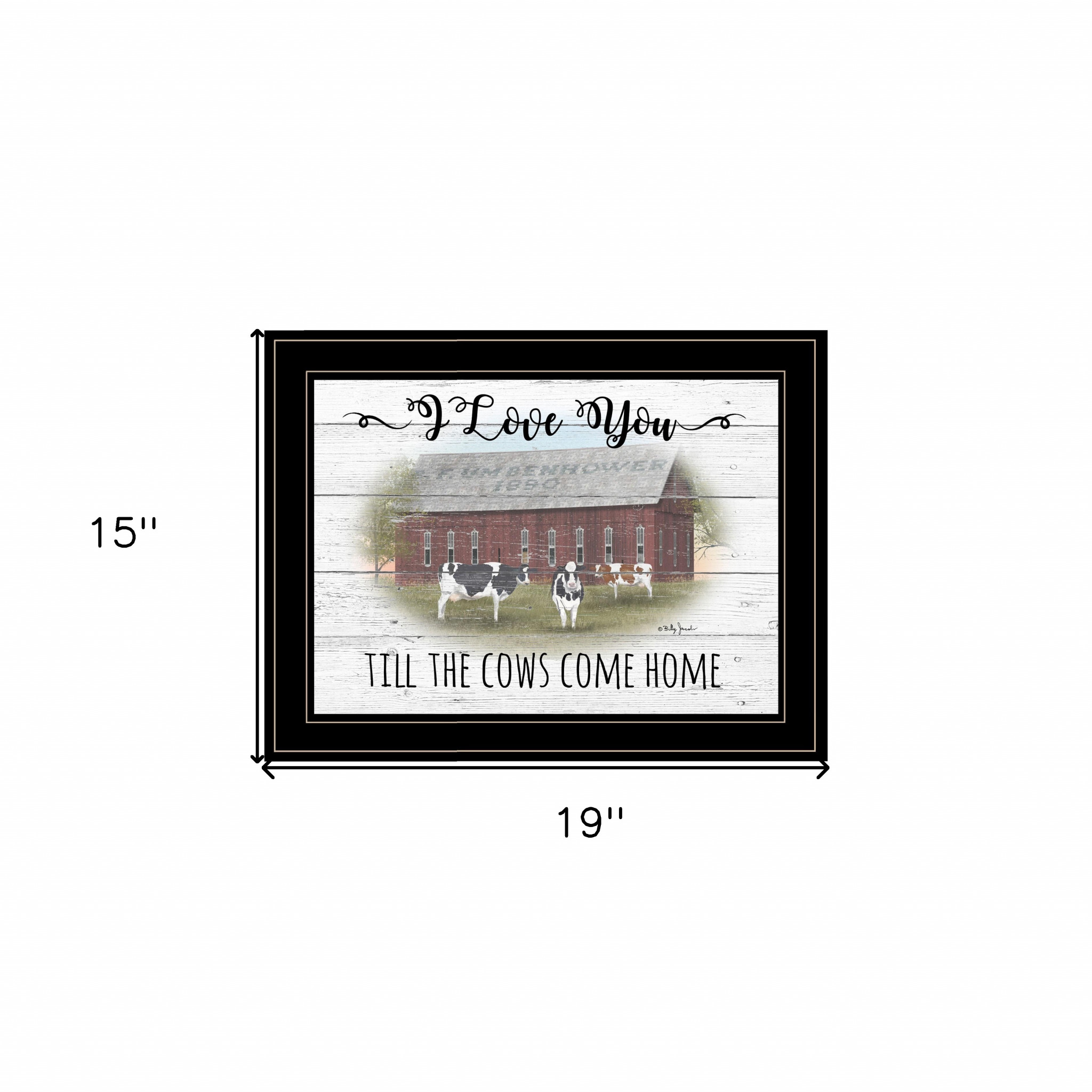 Unique and decorative, this i love you till the cows come home 2 black framed print wall art will leave a lasting impression. This print is a visual artistic expression that allows you to decorate your space in style. Reproduced for you on paper, this hanging decorative accent will be a trendy and fashionable way to dress your walls. Adding this hanging wall art to your space to make your room feel more finished and attractive. Utilize this opportunity to create a focal point in the room with this fabulous wall decor option. 15-inch H x 19-inch W x 1-inch D