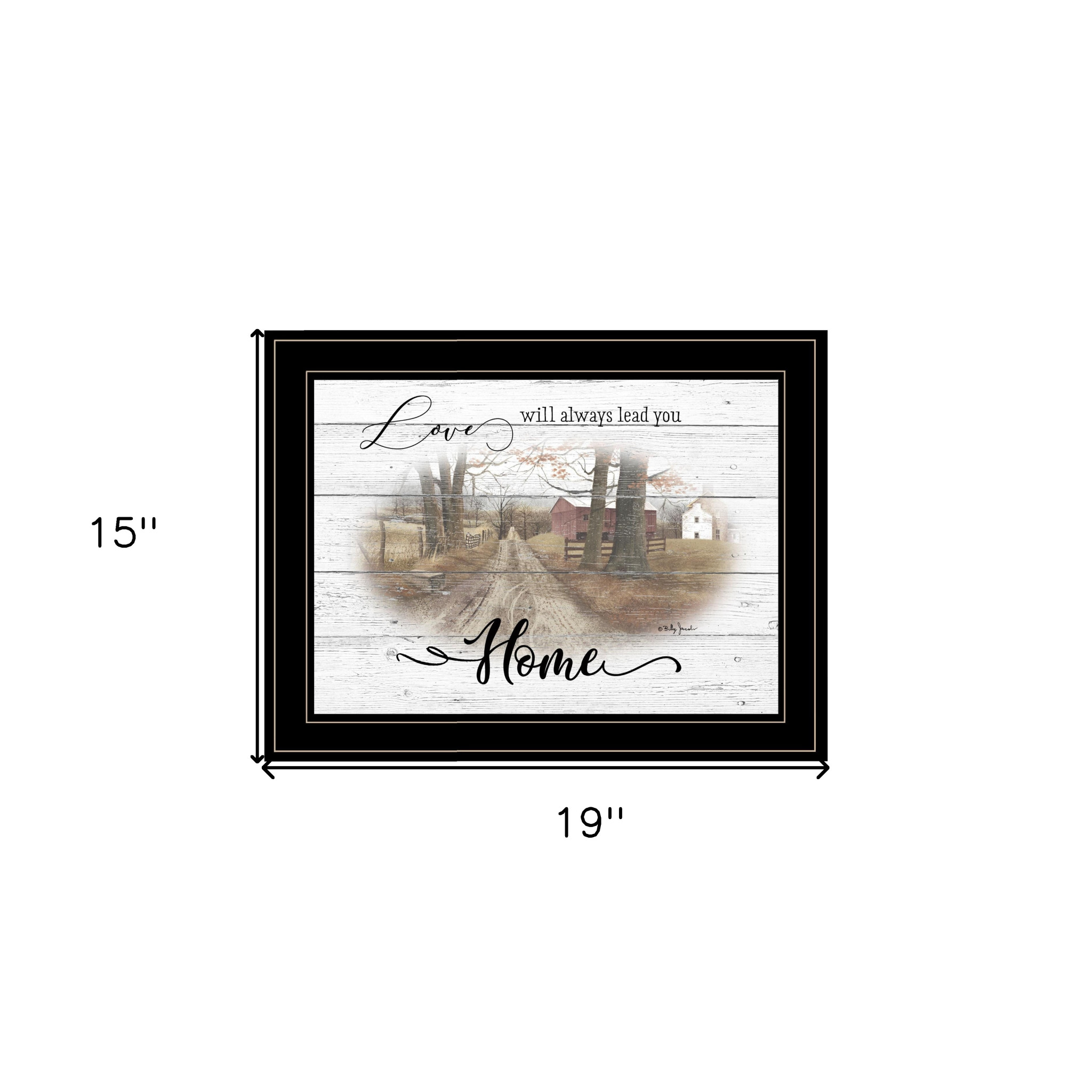 Unique and decorative, this love will always lead you home farmhouse black framed print wall art will leave a lasting impression. This print is a visual artistic expression that allows you to decorate your space in style. Reproduced for you on paper, this hanging decorative accent will be a trendy and fashionable way to dress your walls. Hang on your wall to add some up to date fashion and decoration. Instantly liven up your space with this art that brings color and dimension to your walls. 15 inches H x 19 inches W x 1 inches D