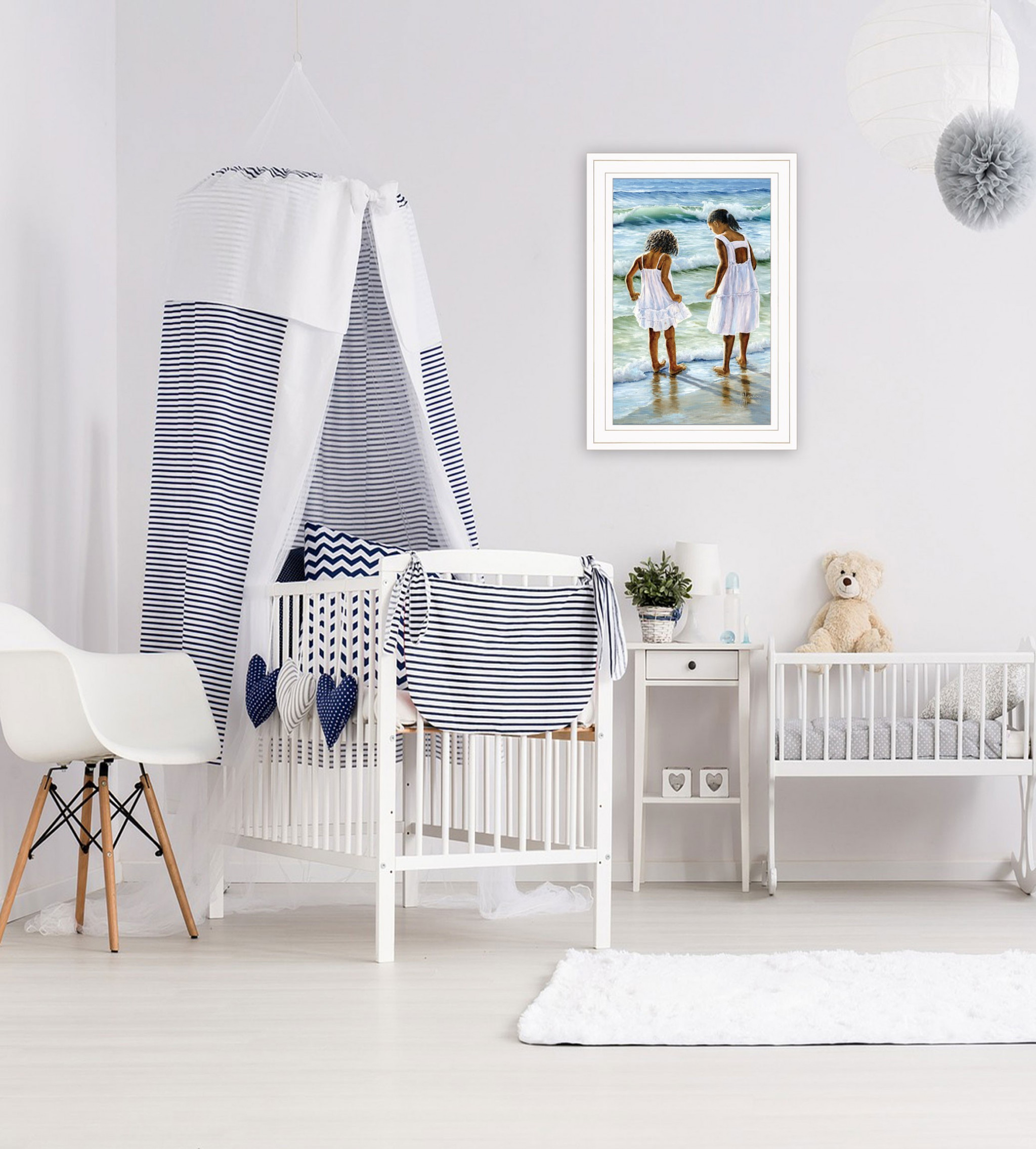 This two girls at the beach 2 white framed print wall art will add a beautiful decorative accent to your decor. This print is a visual artistic expression that allows you to decorate your space in style. Reproduced for you on paper, this hanging decorative accent will be a trendy and fashionable way to dress your walls. Hang on your wall to add some up to date fashion and decoration. Utilize this opportunity to create a focal point in the room with this fabulous wall decor option. 15-inch H x 11-inch W x 1-inch D