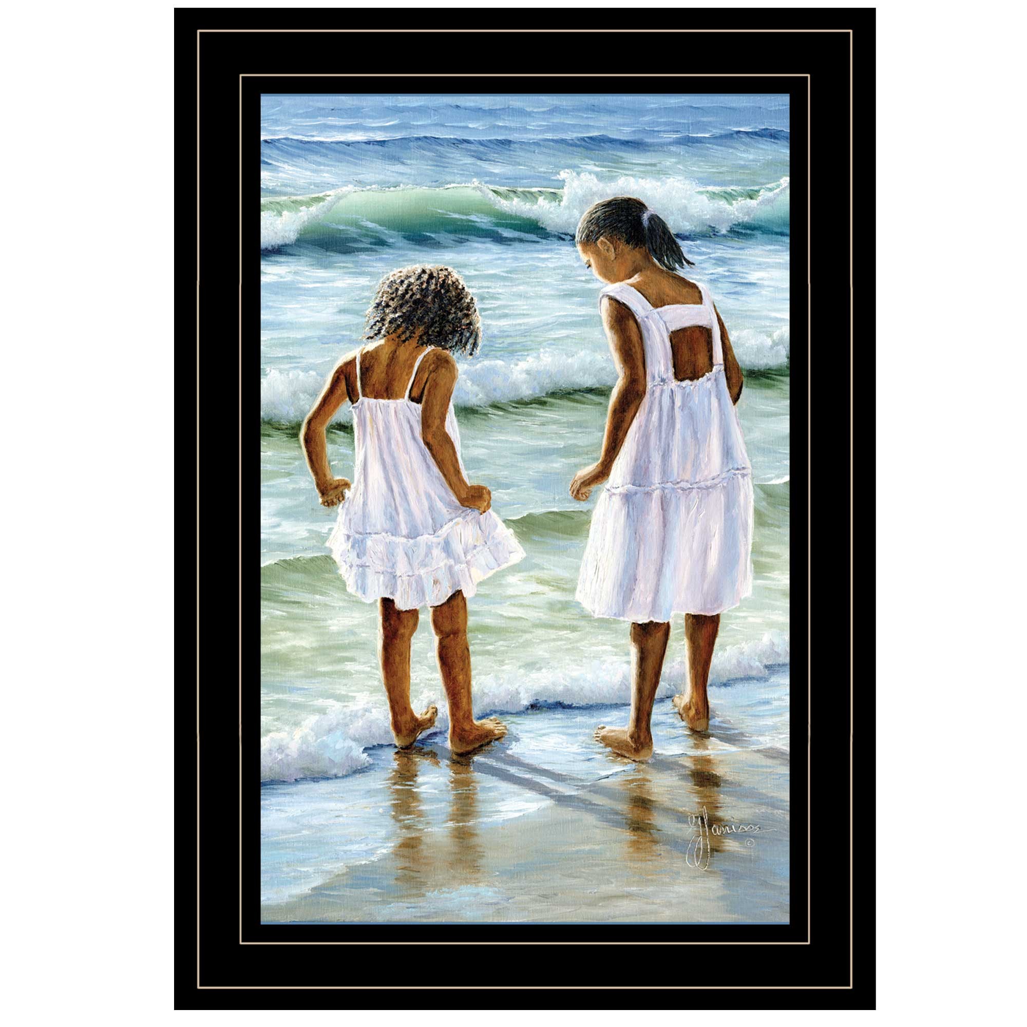 The two girls at the beach 4 black framed print wall art is the perfect decorative accessory for your home. This print is a visual artistic expression that allows you to decorate your space in style. Reproduced for you on paper, this hanging decorative accent will be a trendy and fashionable way to dress your walls. Hang on your wall to add some up to date fashion and decoration. Utilize this opportunity to create a focal point in the room with this fabulous wall decor option. 15-inch H x 11-inch W x 1-inch D