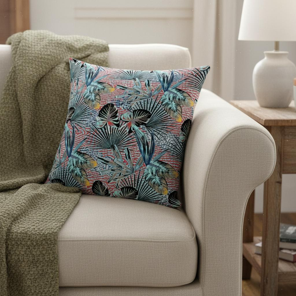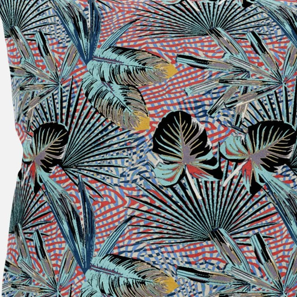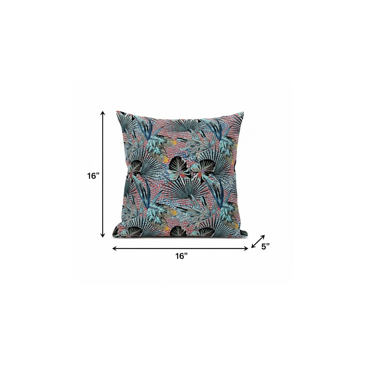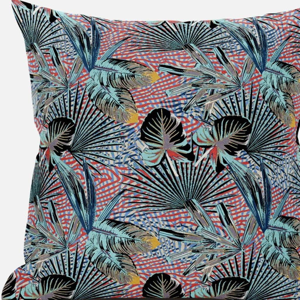 Emphasize a tropical essence into your living space with this stunning Aqua Red Tropical Suede Throw Pillow that features botanical elements to inspire positive energy and evoke a sense of relaxation in the room. The tropical leaves in aqua blue and tints of black create an eye-catching canopy over the gridded rosy red and soft blue base, meant to set a welcoming atmosphere in any costal, contemporary, or tropical home. The deluxe suede fabric featured on the throw pillow gives it a premium feel while also being durable to last for a long time. The versatile blown pillow is also soft to the touch, given its lush polyfill insert, making it super fluffy and comfortable. Bring home this decorative throw pillow to add pops of colors to your living room with a calm and comforting ambiance. 16” x 16” x 5”