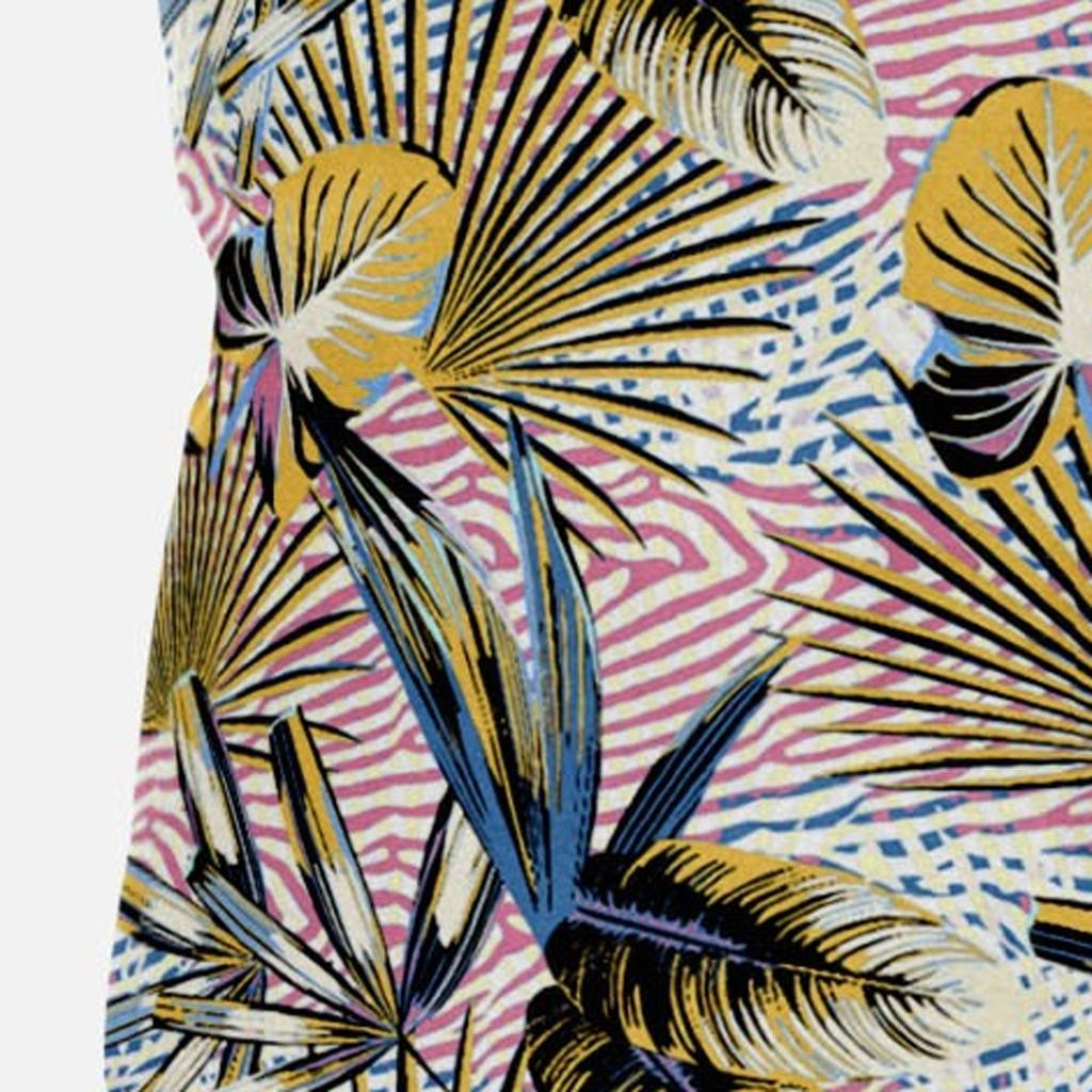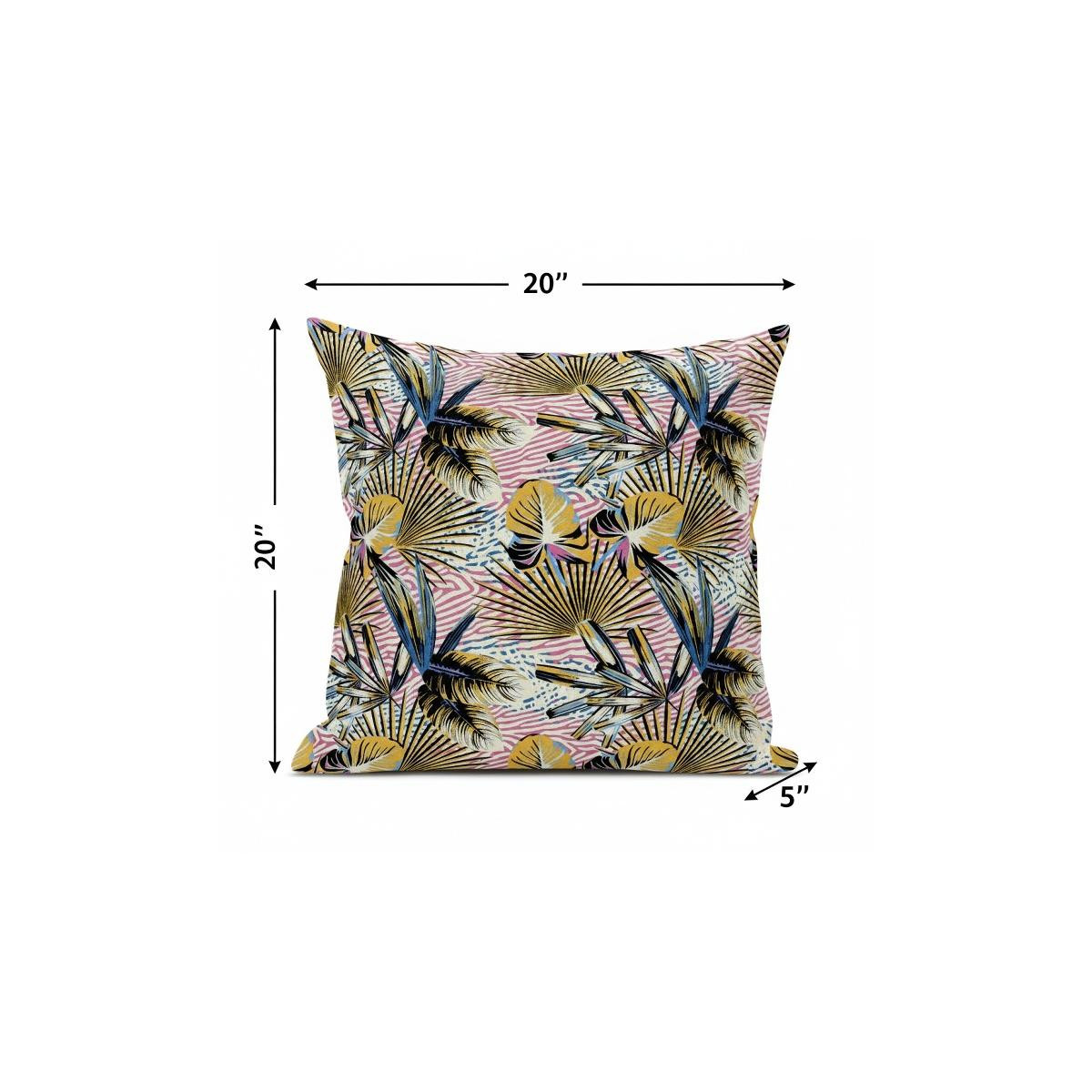 This gorgeous Gold Pink Tropical Suede Throw Pillow is sure to blend in a tropical spirit into your contemporary household while being an eye-catching centerpiece in the room. The mesmerizing botanical theme features leafage in faded gold, azure blue, and a touch of black over a zebra-print base in rose pink and white. This blown and closed pillow is crafted from premium-quality suede fabric which is characterized by its soft and smooth surface texture for a delicate feel. With a durable polyfill insert, this pillow feels super soft with a fluffy look that makes it an excellent decorative accent in terms of fashion and functionality. If a fusion of trend, comfort and boho-chic style is what you’re looking for, this one-of-a-kind decorative pillow will be right up your alley. 20” x 20” x 5”