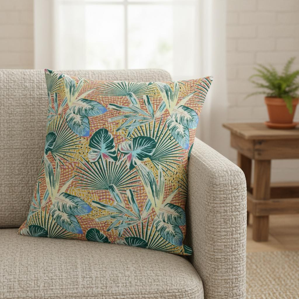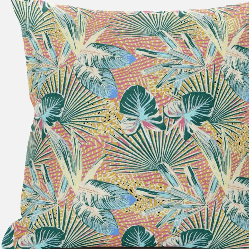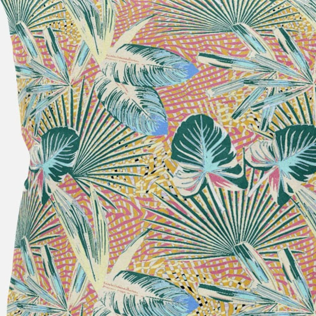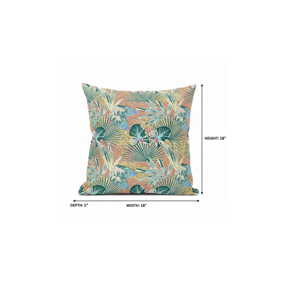Subtle and playful all at the same time, this exquisite Blue Peach Tropical Suede Throw Pillow presents a blend of cool and warm-toned hues to give your tropical living space an alluring update. The pleasant peach-toned base is brimming with lush tropical foliage in shades of light blue and teal for a sense of serenity while the pops of yellow add a lively spirit to the pillow. This blown pillow is crafted from premium-quality suede fabric which is characterized by its soft and smooth surface texture for a delicate feel. With a polyester filling insert as soft as the clouds, the blown and closed pillow is perfectly suited for you to rest your head on. Give any modern, bohemian, or beach-side home a colorful update with this decorative throw pillow that will seamlessly blend in with a variety of interior themes and decors. 18” x 18” x 5”