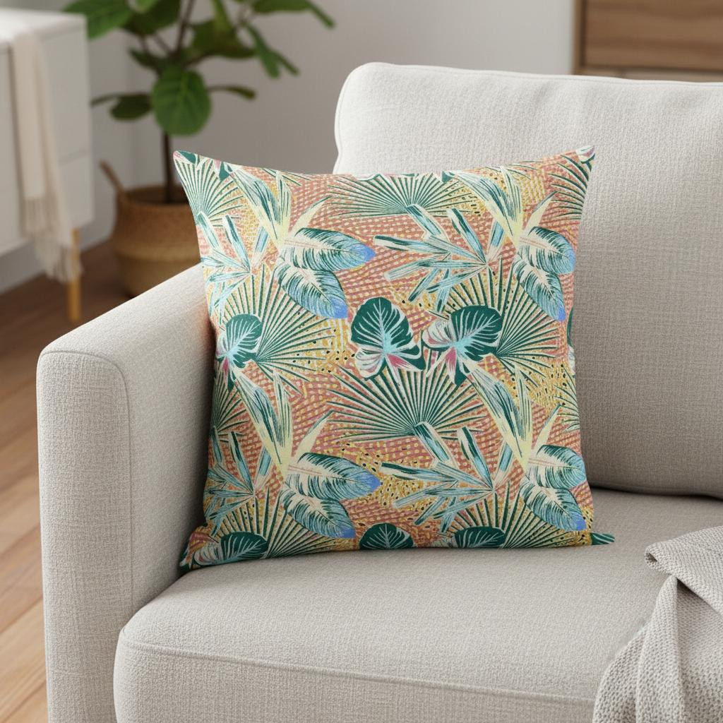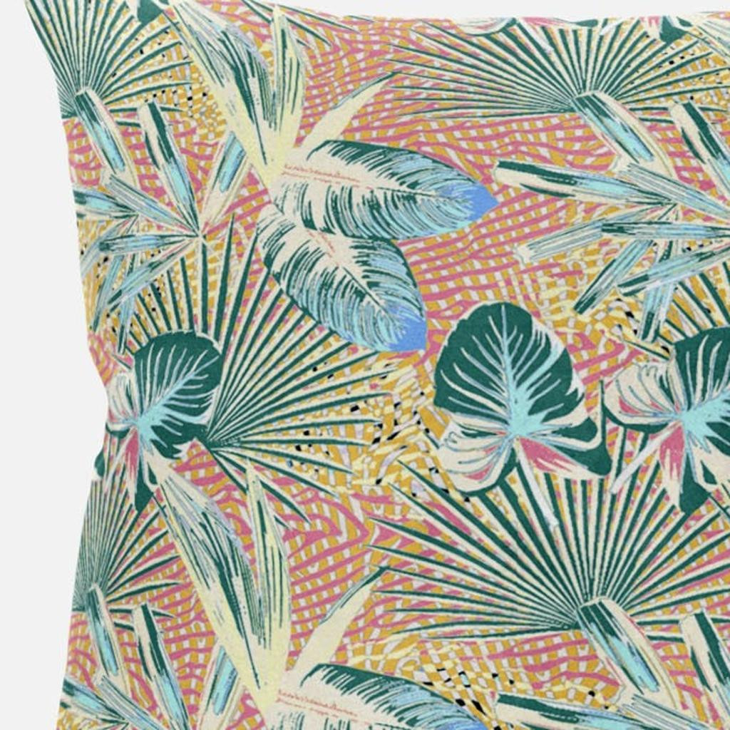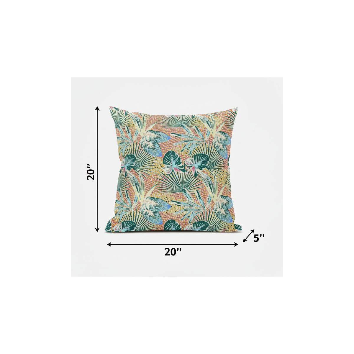 Subtle and playful all at the same time, this exquisite Blue Peach Tropical Suede Throw Pillow presents a blend of cool and warm-toned hues to give your tropical living space an alluring update. The pleasant peach-toned base is brimming with lush tropical foliage in shades of light blue and teal for a sense of serenity while the pops of yellow add a lively spirit to the pillow. This blown pillow is crafted from premium-quality suede fabric which is characterized by its soft and smooth surface texture for a delicate feel. With a polyester filling insert as soft as the clouds, the blown and closed pillow is perfectly suited for you to rest your head on. Give any modern, bohemian, or beach-side home a colorful update with this decorative throw pillow that will seamlessly blend in with a variety of interior themes and decors. 20” x 20” x 5”