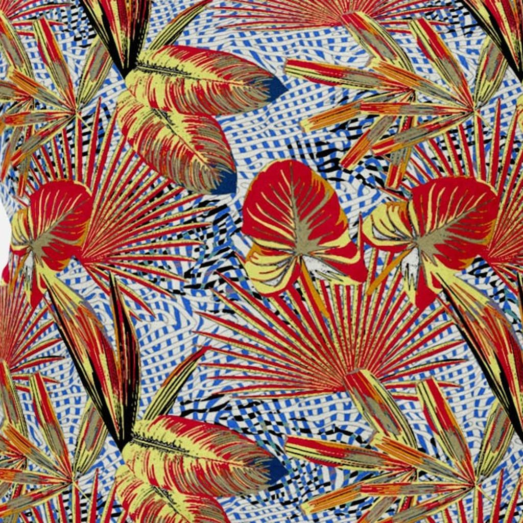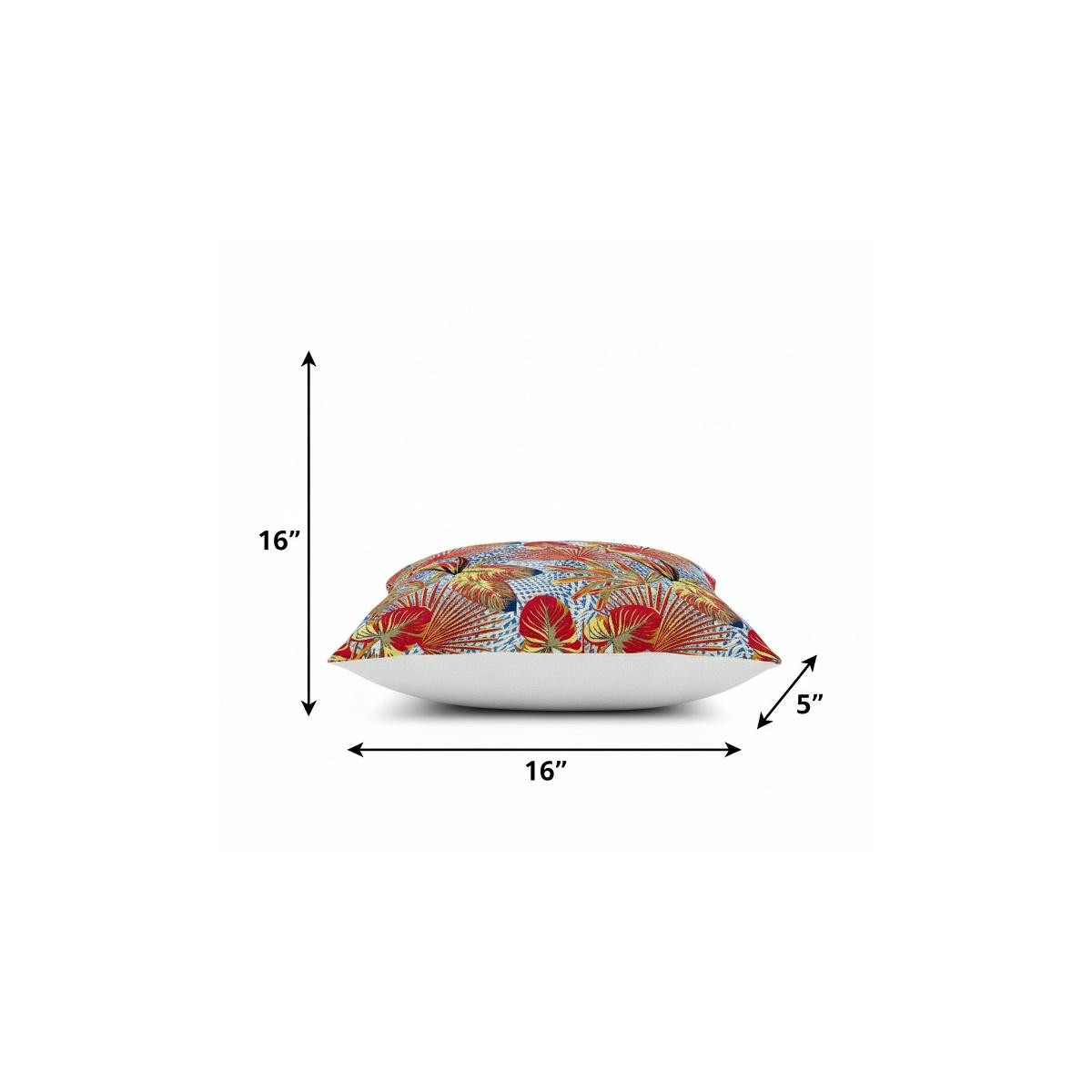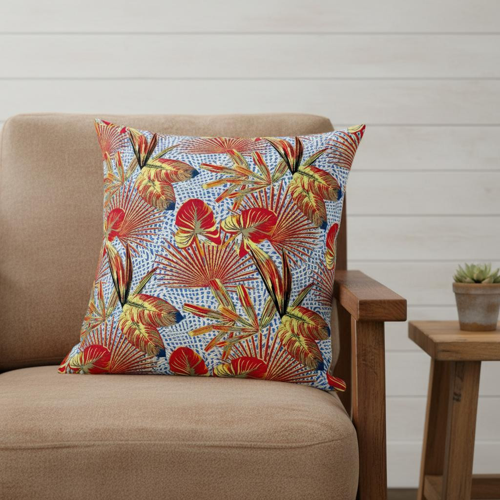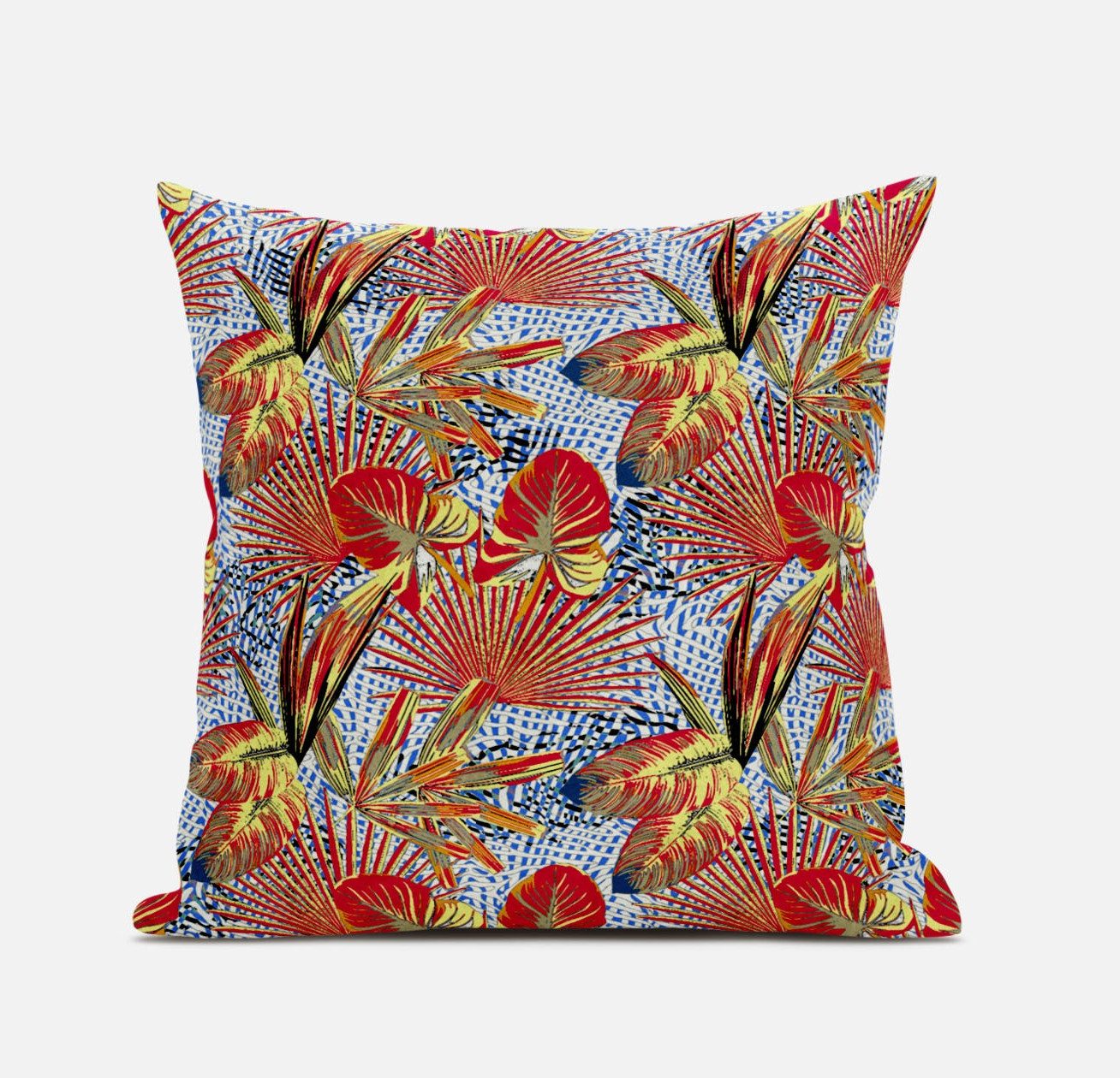 Personalize the style of your living space by adding this striking Crimson Yellow Tropical Suede Throw Pillow that features a harmonious combination of hues with a tropical essence. Lush foliage intertwined with a contrast of crimson, yellow and blue pigmentations represents a passion and unity of pleasant day by the beach. This blown and closed pillow is carefully crafted with a premium suede fabric that gives it a feel of luxury while also being functional for everyday use. The plush look and fluffy nature come from the regular polyfill insert that provides a comfortable platform for your head and neck to maximize relaxation. Accentuate the subtle tones of boho poise in your beach-side home and curate a refreshing visual of natural elements with this artistic throw pillow. 16” x 16” x 5”