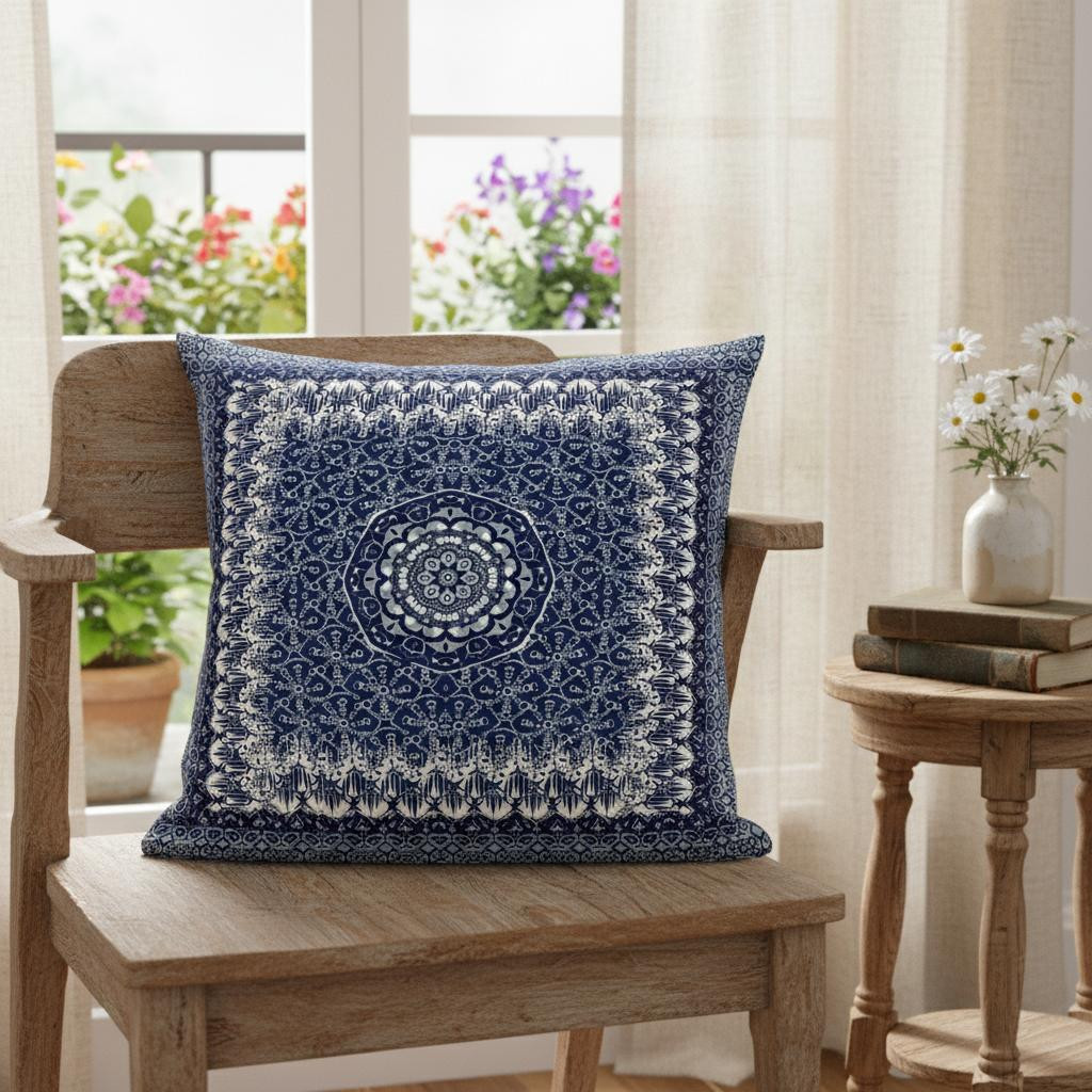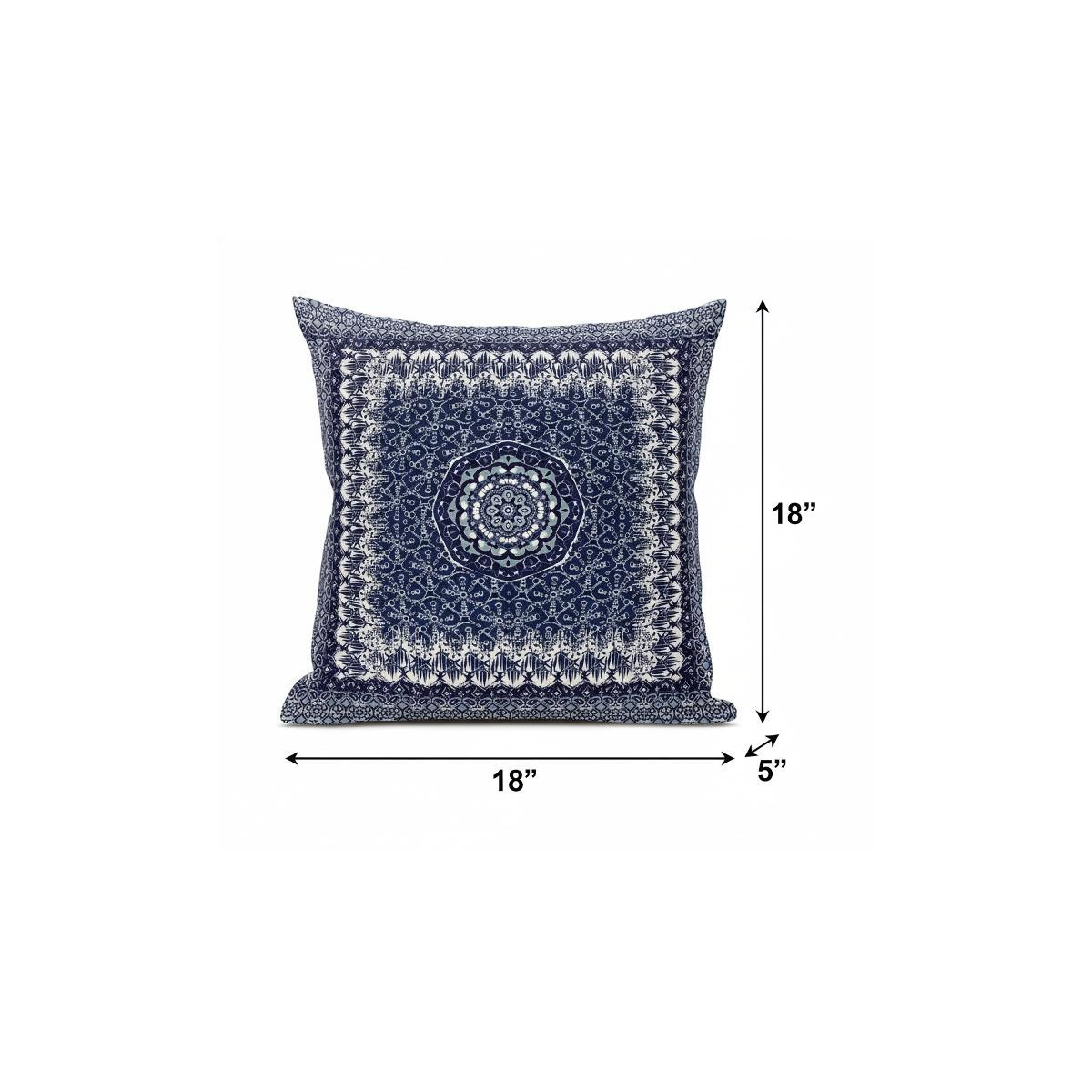 Create a dynamic fusion of contemporary and bohemian style in your home with this stunning Indigo White Holy Floral Suede Throw Pillow. This pillow features an almost floral design in a geometric pattern printed in dark indigo, soft blue, and white creating an intricate geo floral artwork that has a holy vibe to it. Made from superior grade suede fabric for a durable structure and premium feel, it's the perfect accent for adding a velvety appeal to your indoor settings. This blown and closed pillow comes with a soft polyfill insert that gives this piece a plush and fluffy look for utmost comfort. Bring a touch of traditional grace and modern poise into your living space with this beautiful throw pillow and watch it enhance your boho aesthetic in no time. 18” x 18” x 5”