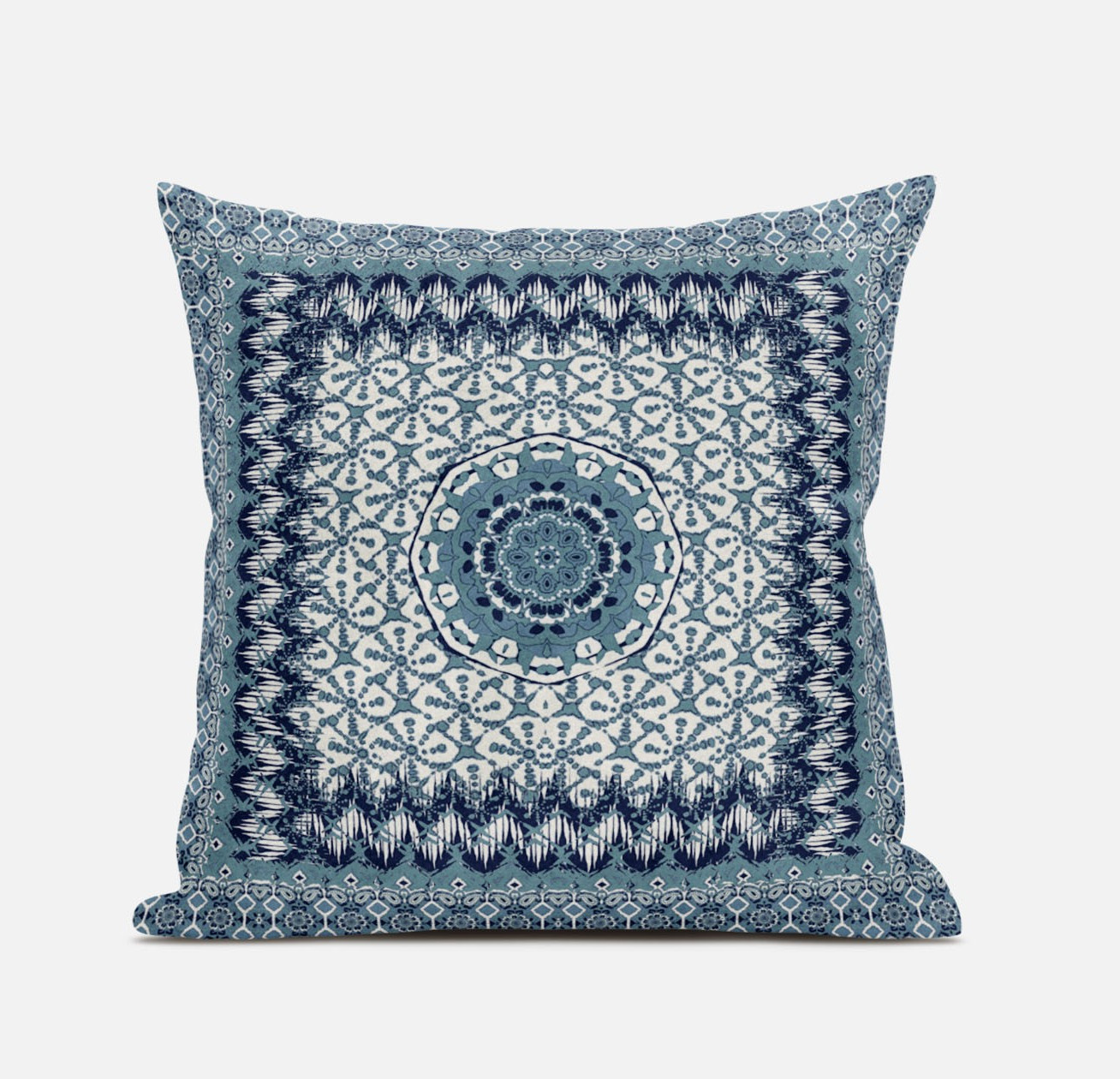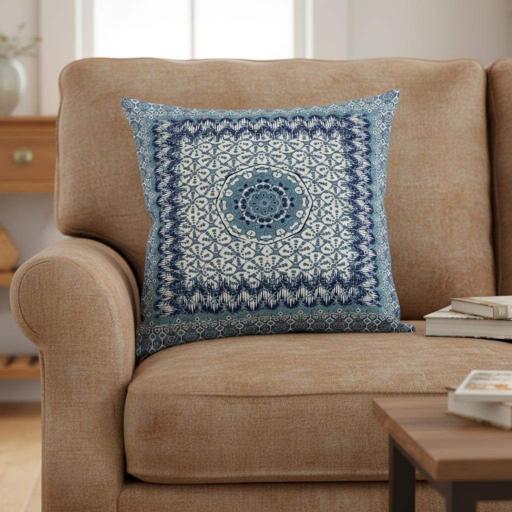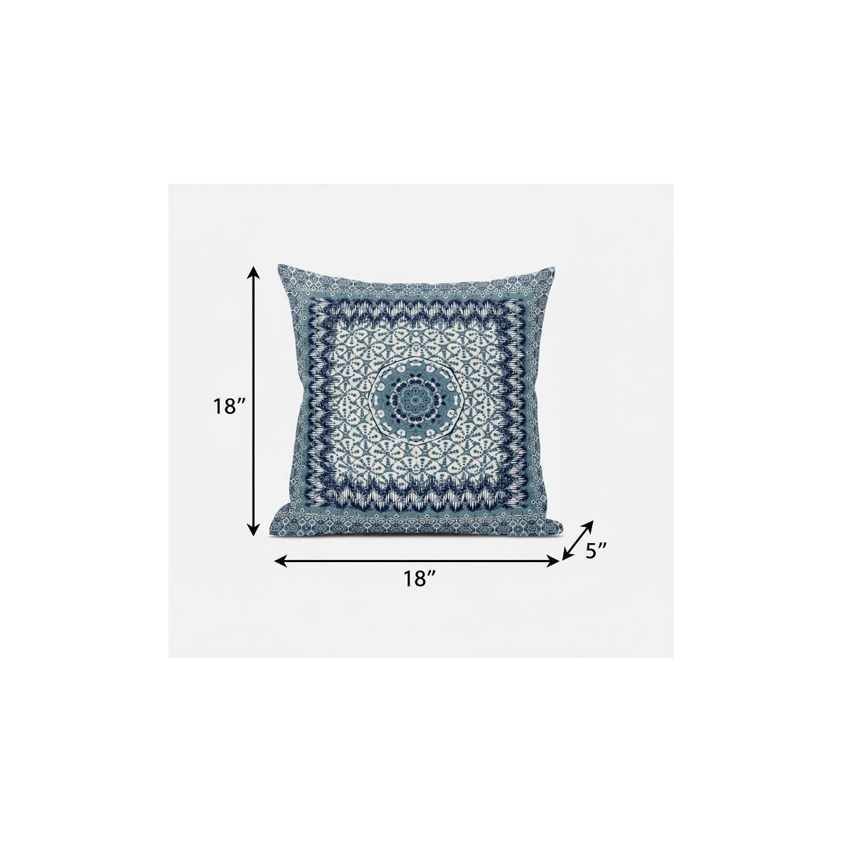 Give your living space an eye-soothing decorative accent with this Blue White Holy Floral Suede Throw Pillow that features a cool-toned palette to induce a relaxing ambiance in the room. The fine fusion of floral and geometric detailing in sapphire blue, indigo, and white creates a pleasant harmony that complements any light or dark-toned bohemian décor. The deluxe suede fabric featured on the throw pillow gives it a premium feel while also being durable to last for a long time. The versatile blown pillow is also soft to the touch, given its lush polyfill insert, making it super fluffy and comfortable. Set a calm and comforting tone into your living room with this beautiful decorative throw pillow paired with your boho-chic interior décor. 18” x 18” x 5”