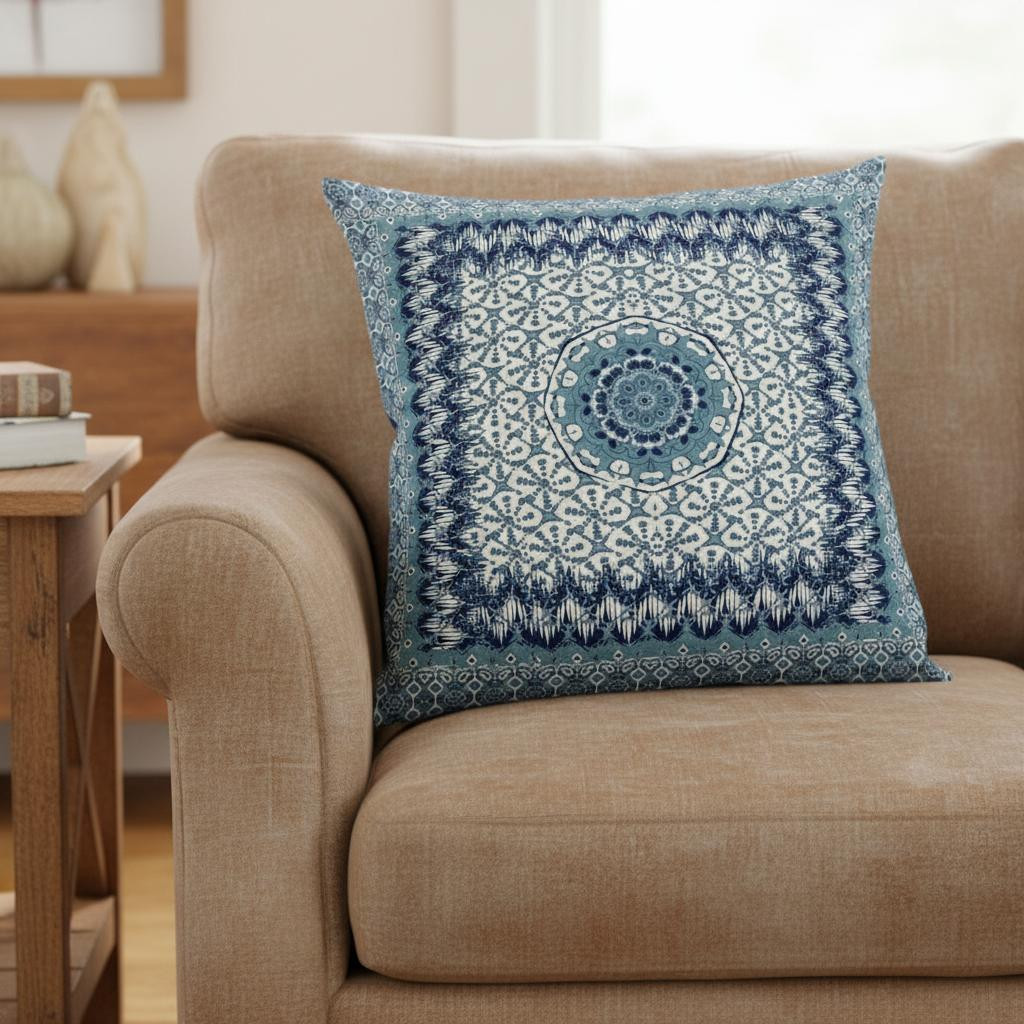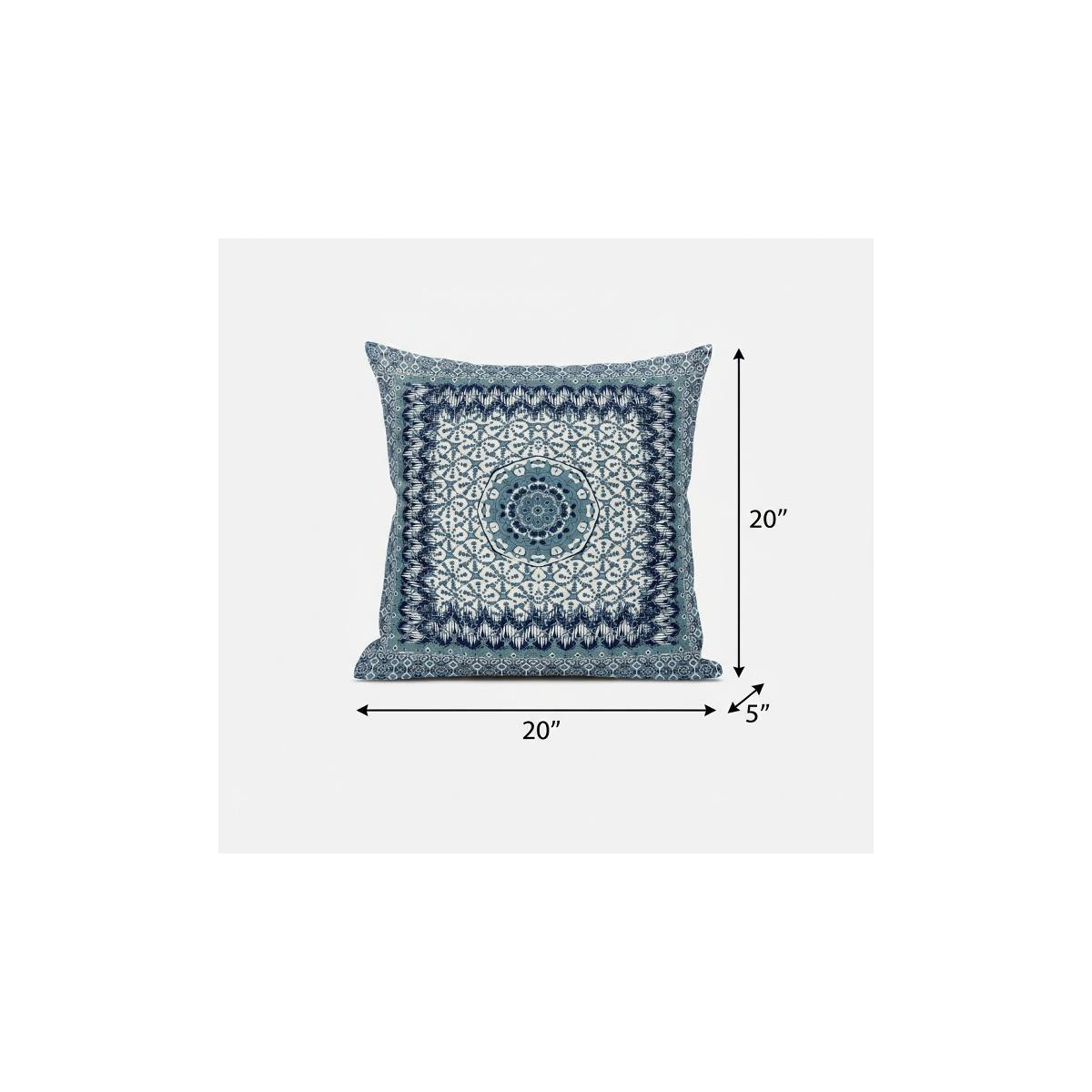 Give your living space an eye-soothing decorative accent with this Blue White Holy Floral Suede Throw Pillow that features a cool-toned palette to induce a relaxing ambiance in the room. The fine fusion of floral and geometric detailing in sapphire blue, indigo, and white creates a pleasant harmony that complements any light or dark-toned bohemian décor. The deluxe suede fabric featured on the throw pillow gives it a premium feel while also being durable to last for a long time. The versatile blown pillow is also soft to the touch, given its lush polyfill insert, making it super fluffy and comfortable. Set a calm and comforting tone into your living room with this beautiful decorative throw pillow paired with your boho-chic interior décor. 20” x 20” x 5”