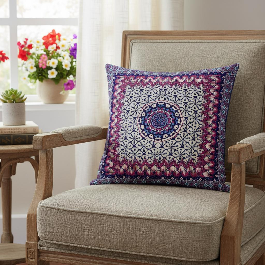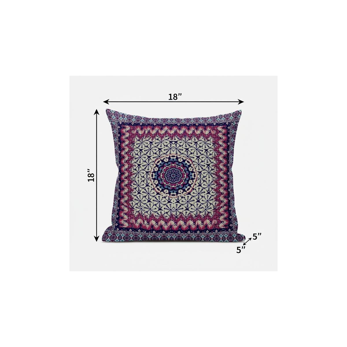 Add a lovely pop of colors to your living space with this Magenta Indigo Holy Floral Suede Throw Pillow that features alluring design patterns to draw the attention of the guests. The prominent geometric shapes are brimming with intricate floral patterns in cool-toned magenta, indigo, and beige that look spectacular with a bohemian flair. Made from superior grade suede for a durable structure and premium feel, it's the perfect accent for adding a velvety appeal to your indoor settings. This blown pillow is filled with a durable polyfill insert for a soft and fluffy nature, providing maximum comfort when you lean on it. Accentuate the elegance of your home by pairing this boho-chic decorative pillow with a soft-toned sofa or couch. 18” x 18” x 5”