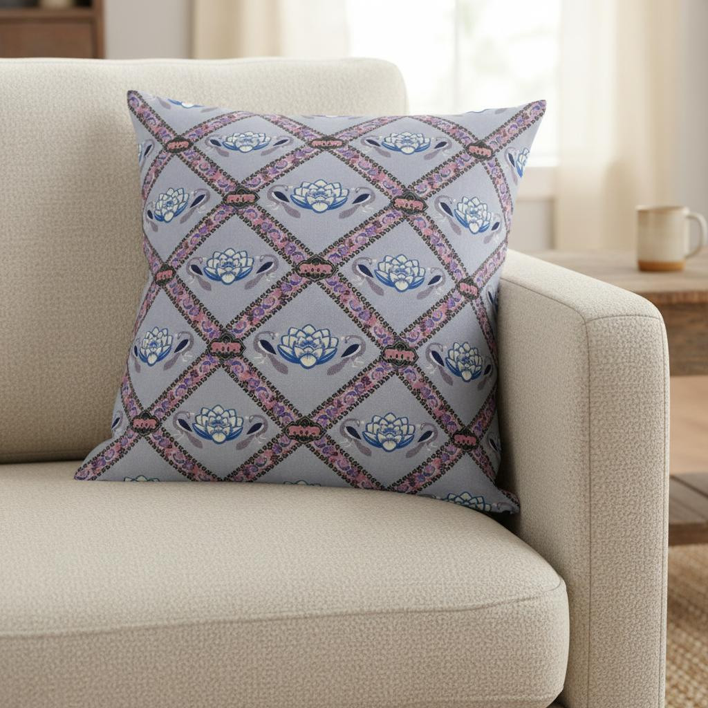 seam suede throw pillow, blown seam suede throw pillow, pink lotus floral blown seam, gray blue pink lotus floral, 20" X 20" gray blue pink |