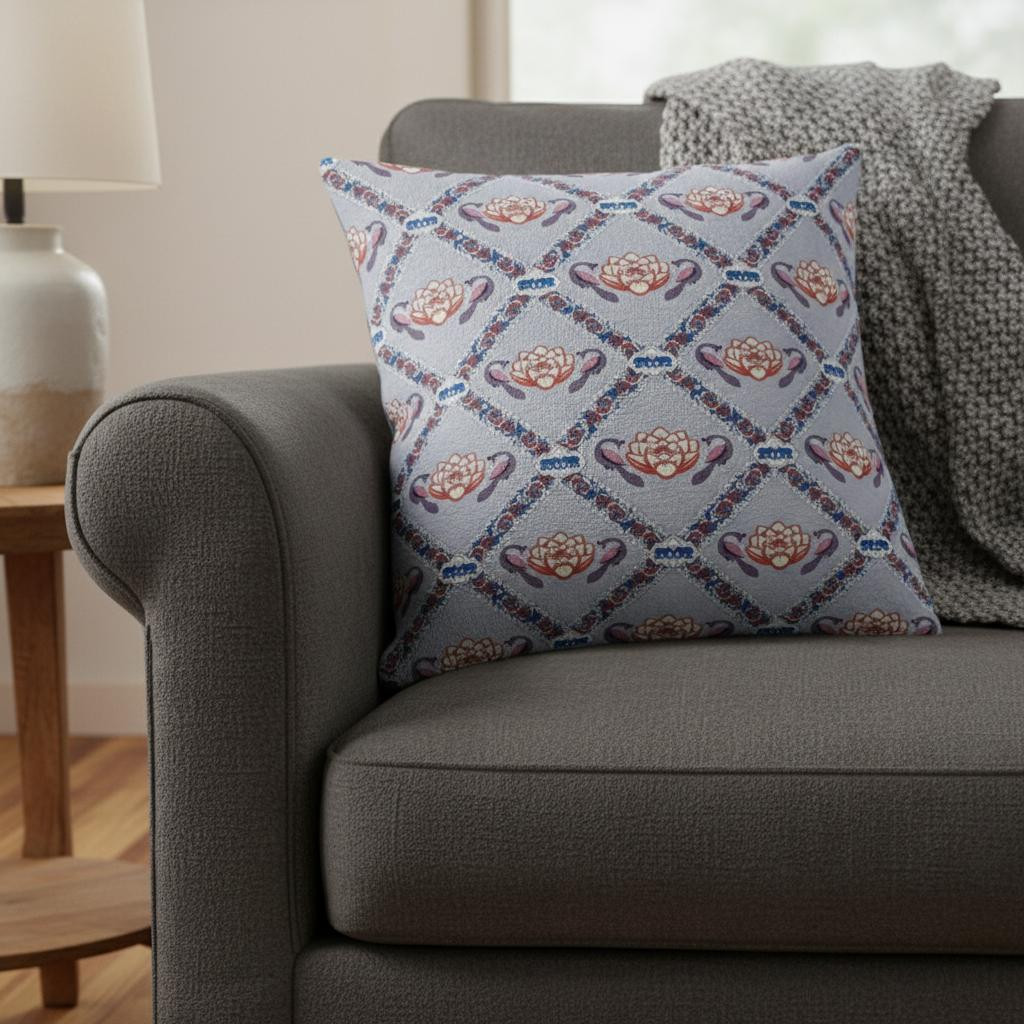 seam suede throw pillow, blown seam suede throw pillow, lotus floral blown seam suede, blue lotus floral blown seam, x16" X 16" gray red blue lotus |