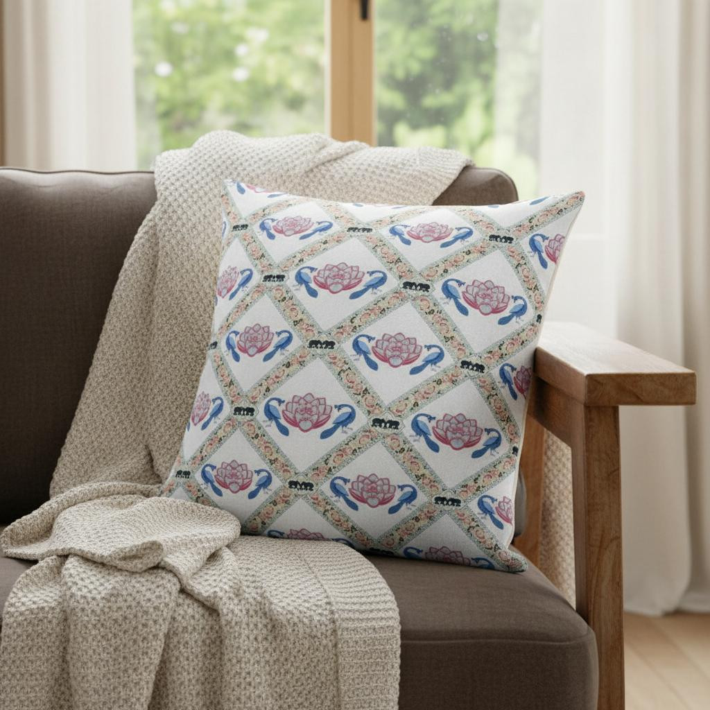 seam suede throw pillow, blown seam suede throw pillow, gray lotus floral blown seam, lotus floral blown seam suede, x18" X 18" white blue gray lotus |