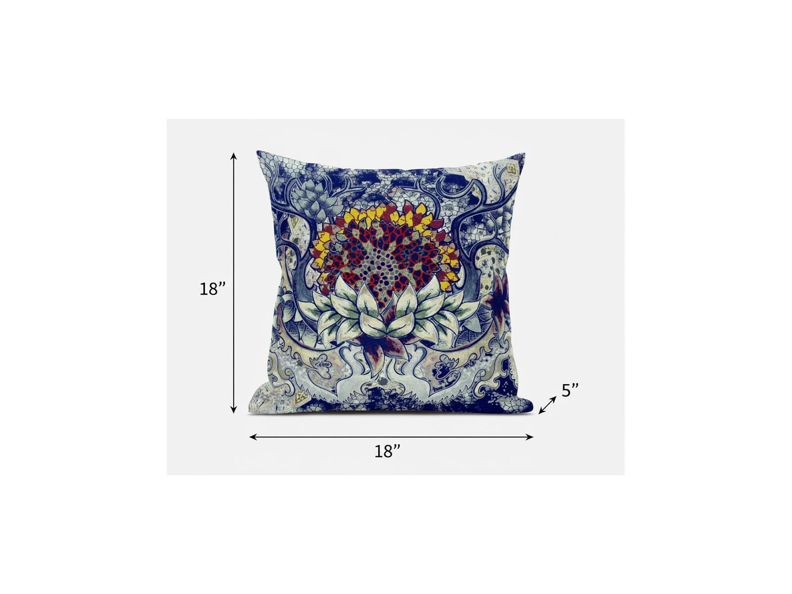 Bring home the enchantments of folklore and fantasy with this exquisitely designed Blue Gray Flower Bloom Suede Throw Pillow. An enthralling floral bloom in yellow and red is surrounded by leaves and fines in blue, green, and gray, creating a magical piece of art to adorn any modern or transitional space. Made from high-quality suede fabric for enhanced durability and softness with a soft and smooth surface texture that feels luxurious on the touch. This pillow is blown and closed with a durable polyfill insert which gives the piece a plush and fluffy look, making it ideal for resting or sleeping with utmost comfort. If you lean towards intricate patterns and startling hues, this decorative throw pillow is the perfect accent piece to stand up to your expectations. 18” x 18” x 5”