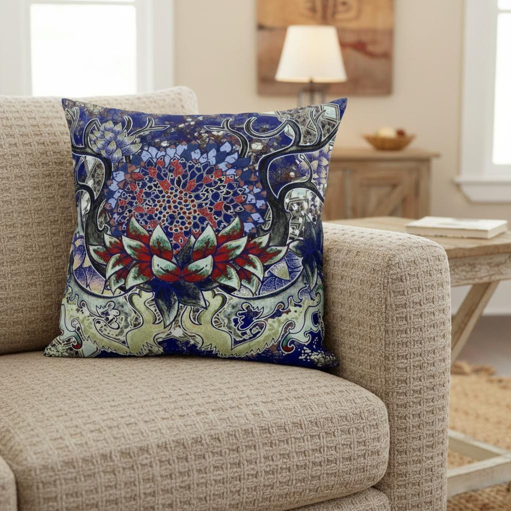 Enliven your living space with the visual charm of this Blue Red Flower Bloom Suede Throw Pillow that features a blend of captivating hues to allure the gaze of the guests. Showcasing a mystic forest with floral vines and creepers in electric blue, red, green, and gray to create a stunning contrast meant to complement any casual or transitional space. This blown and closed pillow is crafted from premium-quality suede fabric which is characterized by its soft and smooth surface texture for a delicate feel. With a durable polyfill insert, this pillow feels super soft with a fluffy look that makes it an excellent decorative accent in terms of fashion and functionality. If you want a bold piece of décor without overwhelming the space, go for this cool-toned decorative pillow that will add colors to your living room with poise. 18” x 18” x 5”