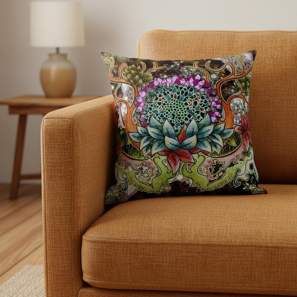 Connecting with mother nature is made easy with this Green Orange Flower Bloom Suede Throw Pillow featuring motifs and hues that will entice you with warm naturalistic vibes. The electric blue sunflower center paired with mesmerizing shades of tangerine orange, hot pink, purple and pale green is surely a visual treat that fills your home with joy. Crafted with high-quality suede fabric, this eco-friendly pillow gives off a luxurious appearance with a silky-smooth finish while ensuring long-lasting durability. This blown and closed pillow features a high-quality polyfill insert ensuring only the softest and cuddliest experience whilst also being easy to clean. Adorn any room with this breathtaking piece of art to showcase your brilliant sense of boho-chic and contemporary style. 18” x 18” x 5”