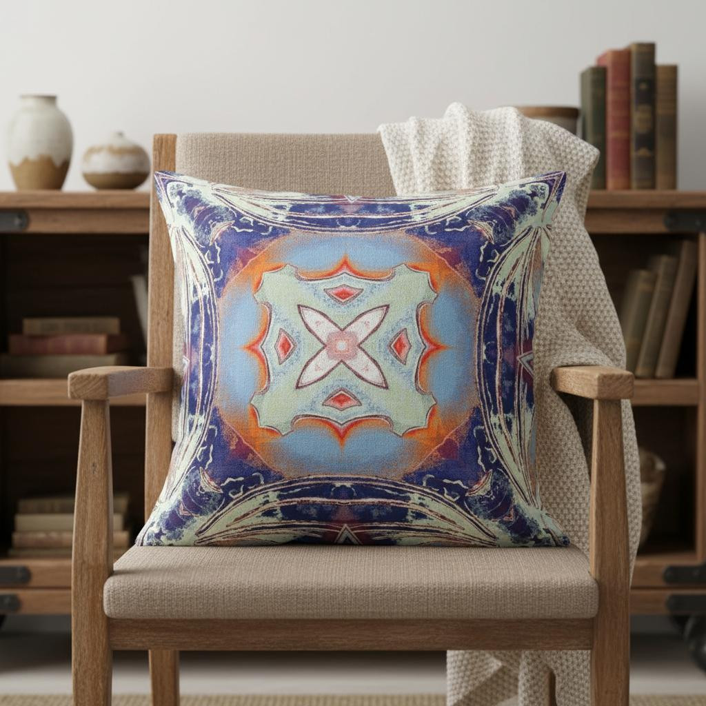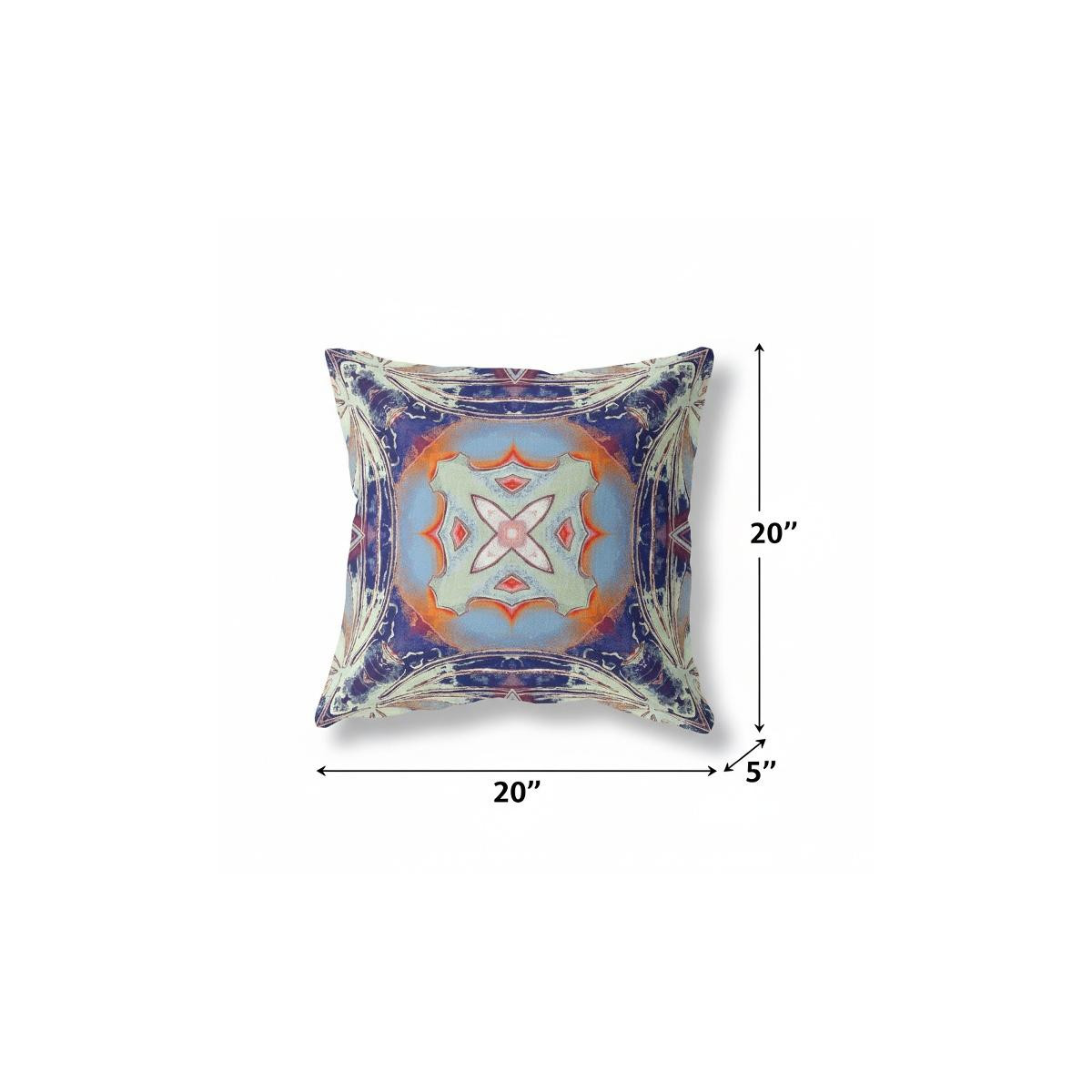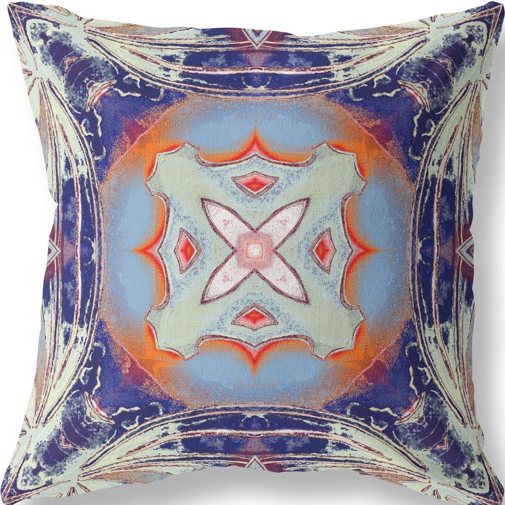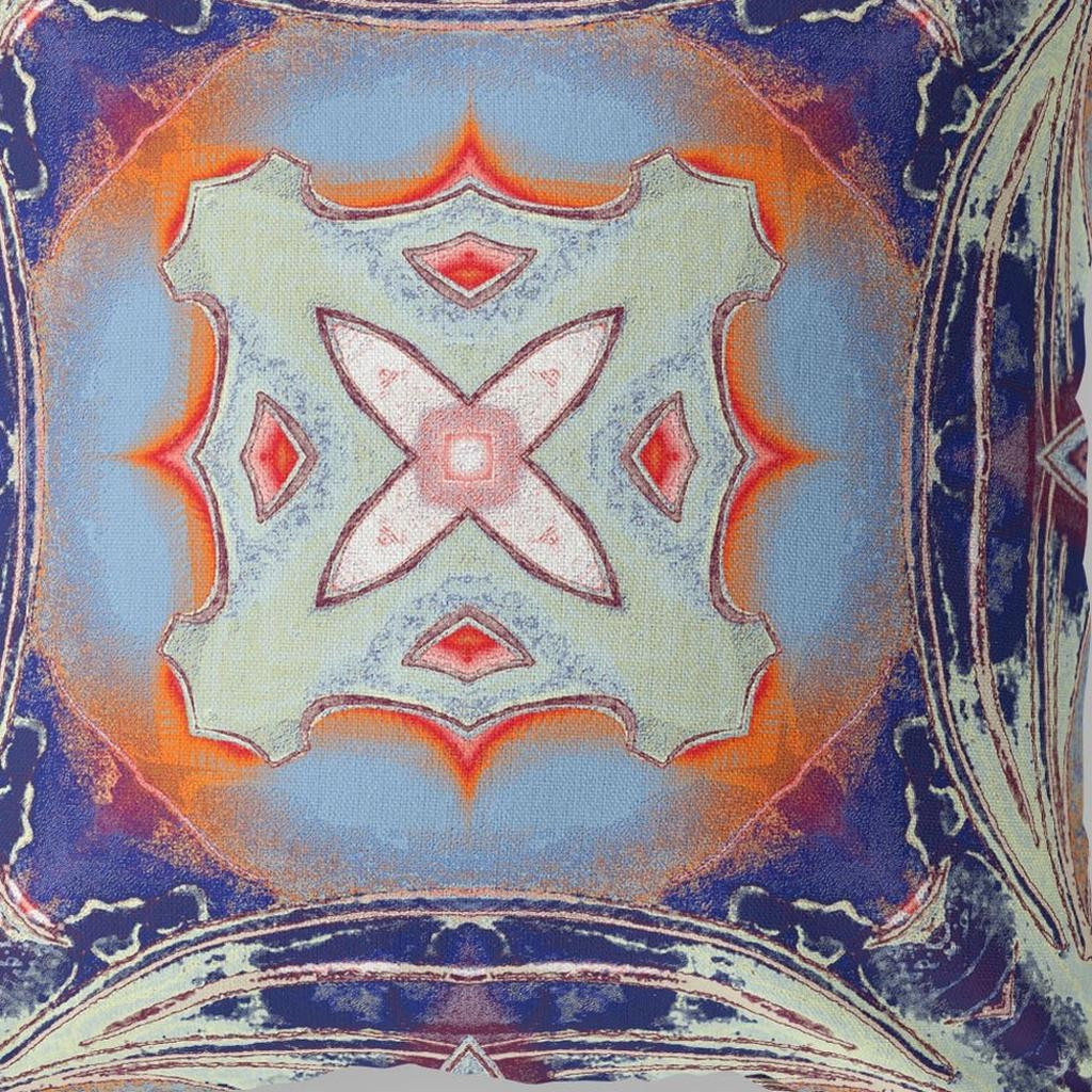 The exquisite Indigo Orange Geo Tribal Suede Throw Pillow emblems a captivating piece of décor that exudes an ethnic essence with a modern touch. The attractive pale blue tribal motif is beautifully placed within a circular gradient of sky blue and orange while the curvy square silhouette around the edges in contrasting cream and indigo creates visual intrigue. The velvety-soft aesthetic of the eco-friendly suede fabric provides a classy look while ensuring durability for regular use. The premium quality soft polyfill insert makes the pillow utterly comfortable with a luxurious feel on the touch. The alluring design and bold color palette make this throw pillow a perfect piece to accentuate a tribal touch to any modern or bohemian home. 20” x 20” x 5”