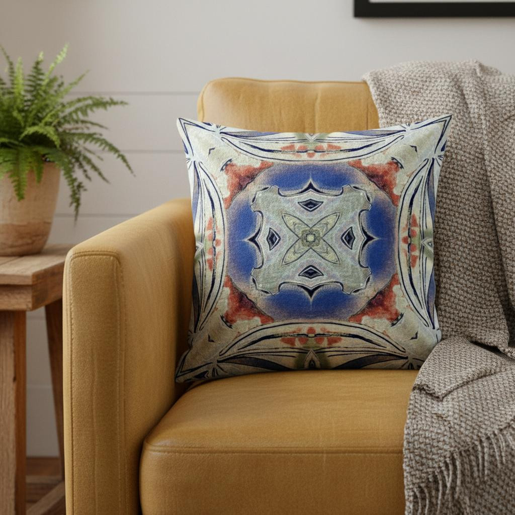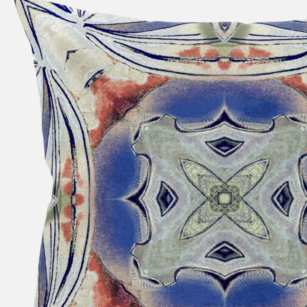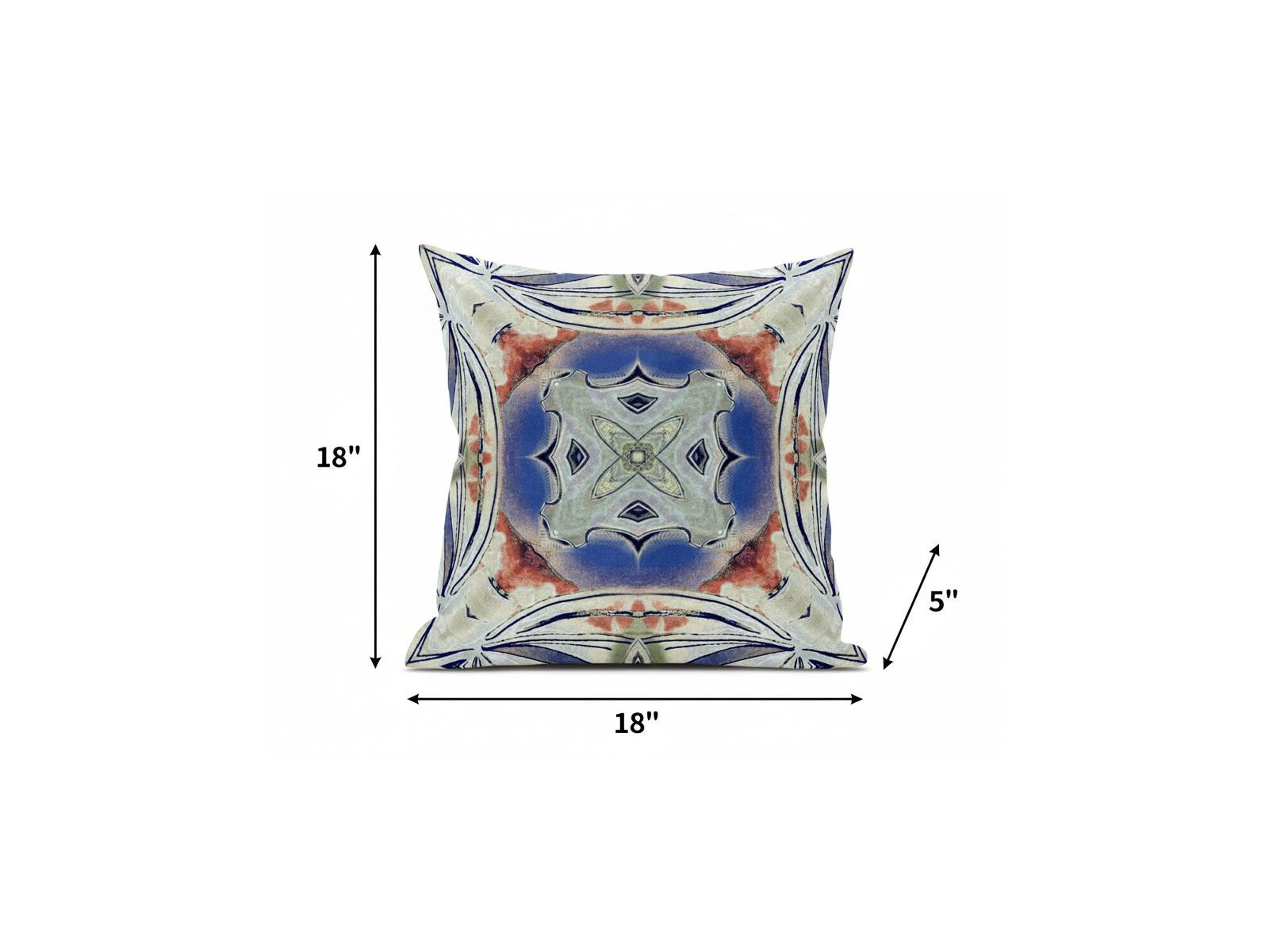 Centering a geometric flower with a boho-chic vibe, this Cream Peach Geo Tribal Suede Throw Pillow will give a sense of calmness to your interior decor. The soothing pastel palette features a blend of cream and cobalt blue with splashes of peachy pink tones for a pleasant contrast while the strokes of navy around the edges and center give the pillow a tribal essence. This pillow is crafted from premium-quality suede fabric which is characterized by its soft and smooth surface texture for a delicate feel. With a polyester filling insert as soft as the clouds, the blown and closed pillow is perfectly suited for you to rest your head on. Emphasize a comforting atmosphere in your boho-chic living space with this soft-toned throw pillow that is meant to stand out in style and elegance. 18” x 18” x 5”