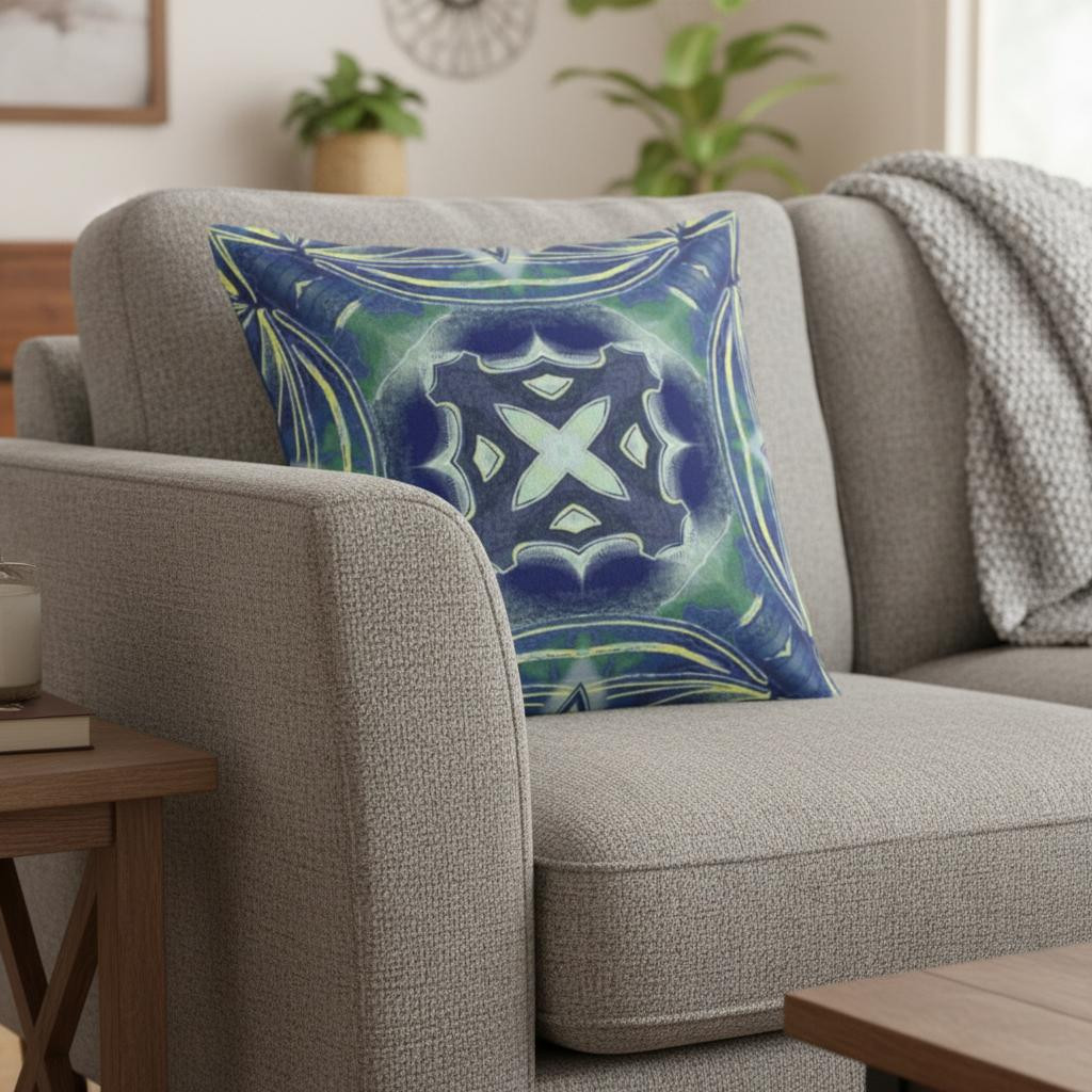 Reflecting the vibe of northern light in its intriguing hues, this Evening Blue Green Geo Tribal Suede Throw Pillow brings forth modern art with a tribal essence to stand out in your living room. The eye-catching blue-toned tribal motif at the center is artistically confined within an evening blue and green circular illusion that transitions towards the edges with hints of yellow for visual illumination. The smooth and silky texture of the suede fabric provides an opulent and sumptuous look while promising long-lasting durability to serve you for years. Featuring a soft polyfill insert, this eco-friendly throw pillow is not only durable but also very plush, fluffy, and super comfortable to lean on. Make your living space more inviting and elegant with this aesthetically rich boho-chic throw pillow flaunted on the sofa or couch. 20” x 20” x 5”
