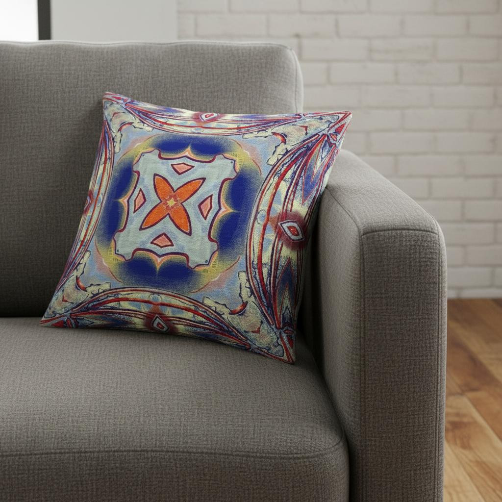 Lend an exuberant tribal vibe with a touch of modernity into your living space with this Red Blue Geo Tribal Suede Throw Pillow. The enticing orange and soft blue geo floral motif is wonderfully captured inside a circular gradient of mesmeric royal blue and hint of yolk yellow, while the red curves over the soft blue-gray base complete the look with a striking visual appeal. The premium quality suede fabric provides this blown and closed pillow with a posh look with a silky smooth finish while assuring long-lasting durability to serve you for years to come. This eco-friendly pillow also features a soft polyfill insert giving it a premium fluffy nature for optimum comfort. Adorn your living space with this vibrant piece of décor and get a semblance of boho-chic fashion. 20” x 20” x 5”