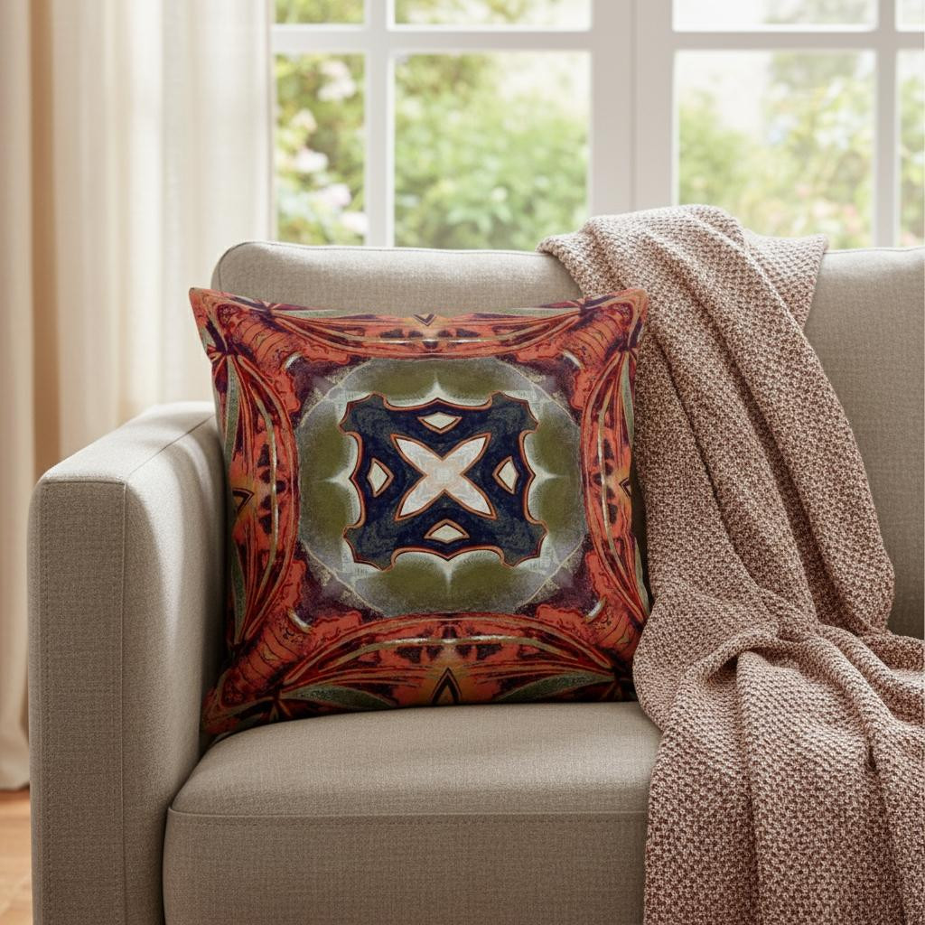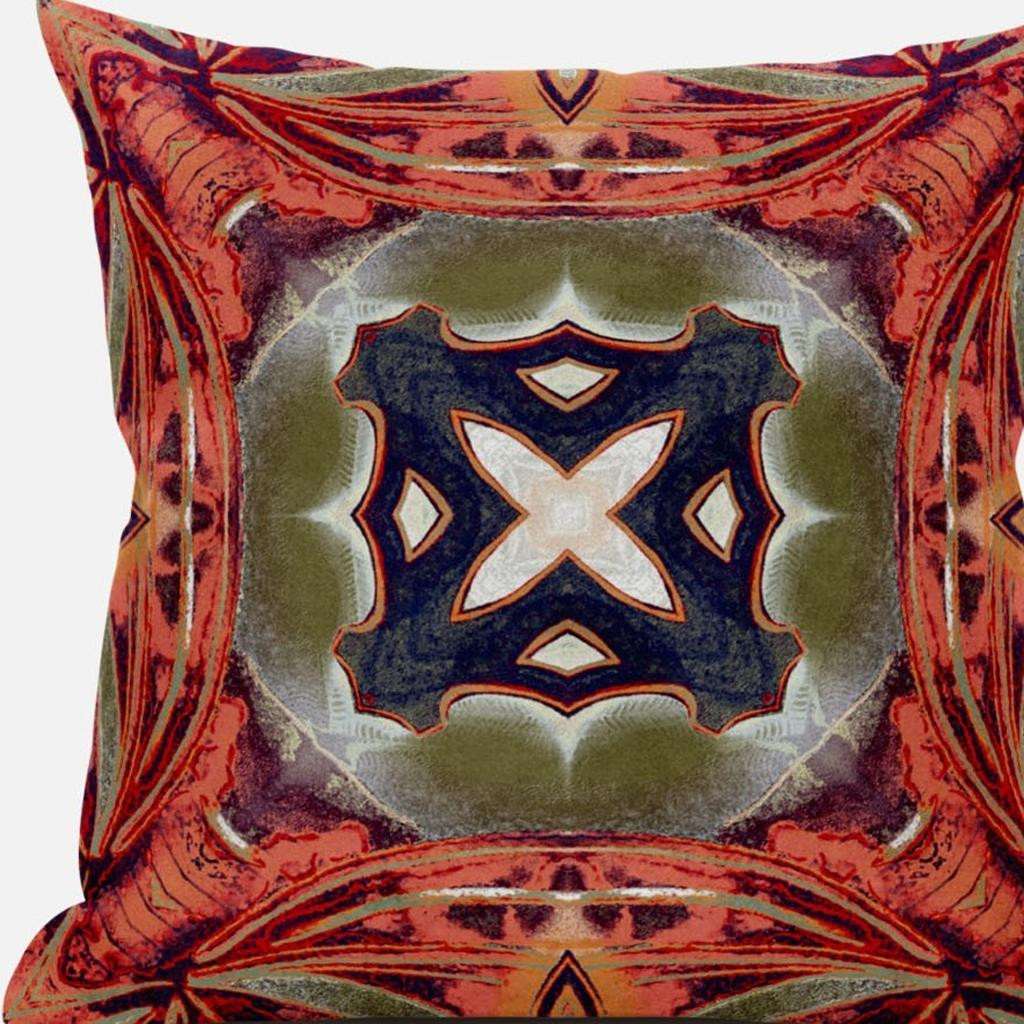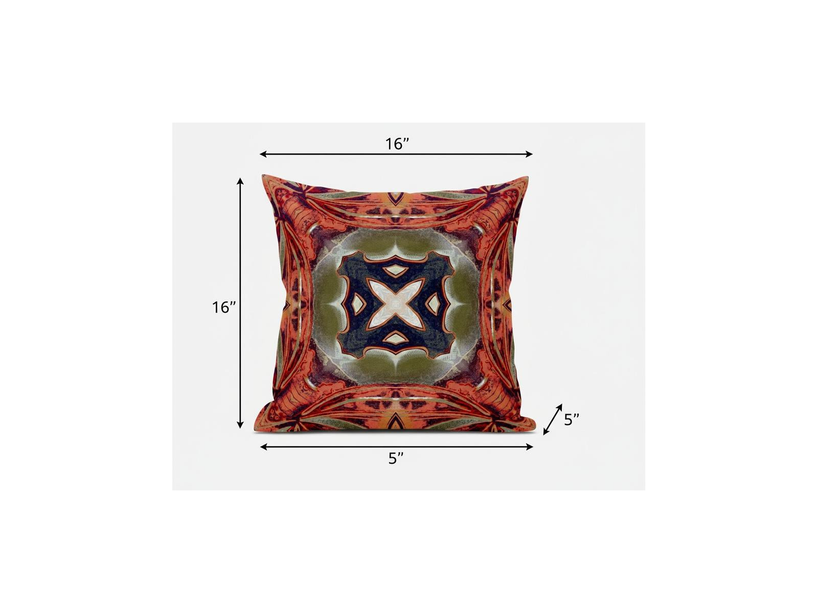 Induce the autumnal time into your interior with this wonderfully printed Peach Sage Geo Tribal Suede Throw Pillow. The bold terracotta color palette offers a blend of burned peach, brown, and subdued orange while centering a beautiful tribal motif on the sage green base contrasted in off-white and dark gray, making it an eye-catchy addition to your bohemian decor. The deluxe suede fabric featured on the throw pillow gives it a premium feel while also being durable to last for a long time. This pillow is filled with 100% polyester fiber insert, giving it a lavish springy feel with a fluffy nature to provide utmost comfort. Combining a bright toned palette with a tribal-inpired pattern, this decorative pillow is sure to set an exuberant tone into your living room. 16” x 16” x 5”
