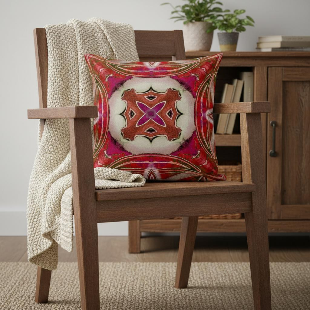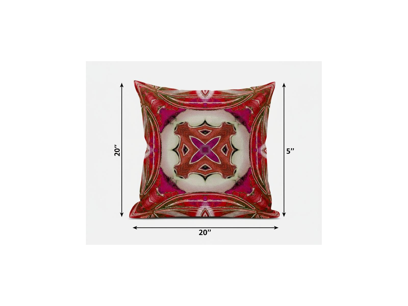 This rich Fuchsia Red Geo Tribal Suede Throw Pillow makes a fascinating bohemian piece of decor for your home that has a tribal feel with a touch of springtime aura. The vibrant fuchsia and red-colored ethnic pattern is elegantly framed inside a circular spectrum of muted peach, white, and hot pink while the wavy sage green lines around the sides offer uniqueness to this throw pillow. This blown and closed pillow is made of sleek and smooth suede fabric that provides a plush and gorgeous look while ensuring long-lasting durability to serve you for years to come. It features a soft polyfill insert that makes it very fluffy and comfy to rest on while giving the piece a luxurious appeal. Pair this decorative pillow with neutral or cool-toned decors and it will seamlessly blend in with its surrounding. 20” x 20” x 5”