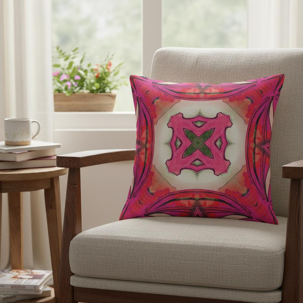 The vibrant colors and unique patterns of this artistic Hot Pink Geo Tribal Suede Throw Pillow exude a tribal essence while having a modern touch to blend in amidst various interior settings. The complementary shades of hot pink form a circular floral motif in the center, visualizing a natural yet eye-catching look. Constructed with a sturdy suede fabric, the pillow is luxurious and has extended durability which allows it to be used for years without losing its shape and shine. The blown and closed pillow features a soft polyester insert which gives it a plush look with a comforting feel, ideal for supporting your neck and back. Embrace the art of boho and let the lively hues of this pillow complement your contemporary décor and brighten up the room in an instant. 18” x 18” x 5”