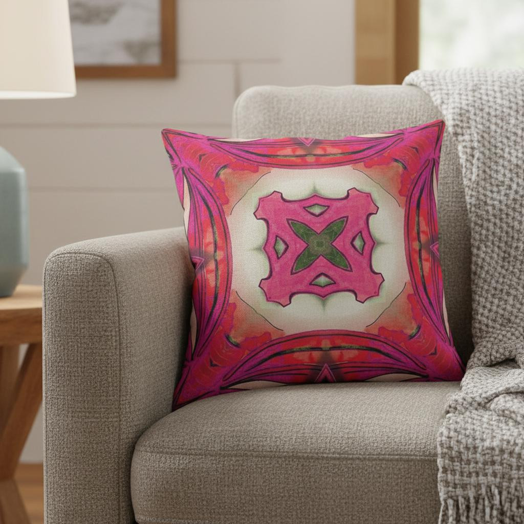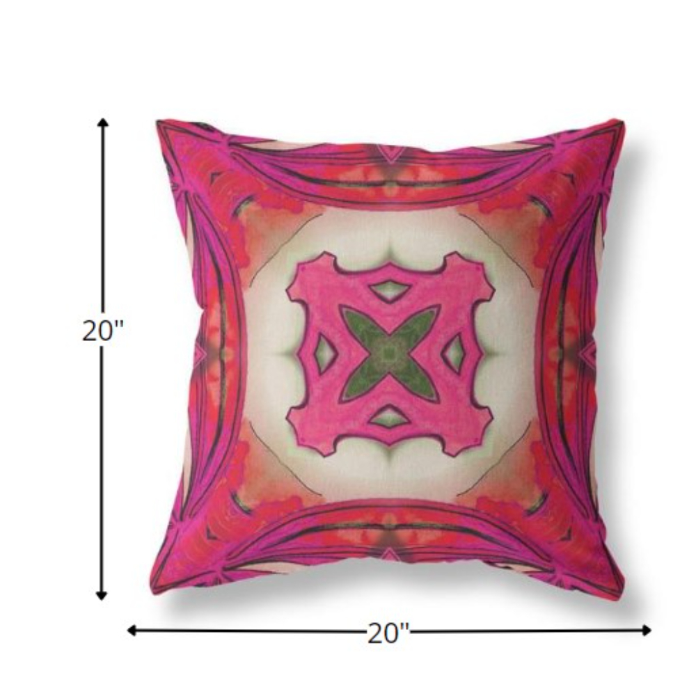 The vibrant colors and unique patterns of this artistic Hot Pink Geo Tribal Suede Throw Pillow exude a tribal essence while having a modern touch to blend in amidst various interior settings. The complementary shades of hot pink form a circular floral motif in the center, visualizing a natural yet eye-catching look. Constructed with a sturdy suede fabric, the pillow is luxurious and has extended durability which allows it to be used for years without losing its shape and shine. The blown and closed pillow features a soft polyester insert which gives it a plush look with a comforting feel, ideal for supporting your neck and back. Embrace the art of boho and let the lively hues of this pillow complement your contemporary décor and brighten up the room in an instant. 20” x 20” x 5”