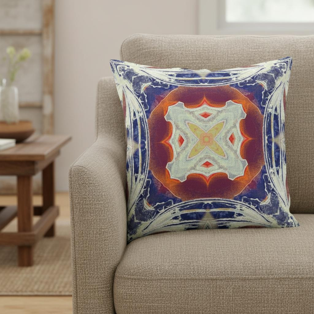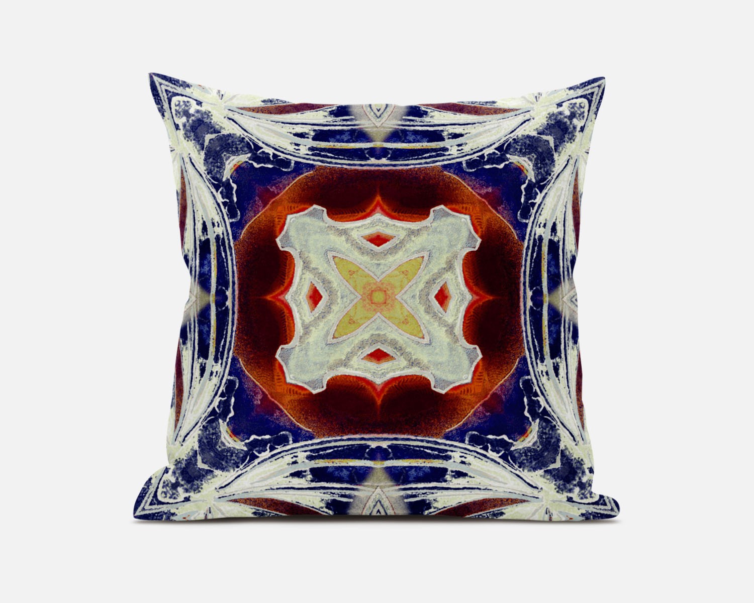 This intense Indigo White Geo Tribal Suede Throw Pillow makes for an enthralling piece of décor that exudes a tribal essence with a modern touch. The alluring white-toned tribal motif is beautifully confined within a circular gradient of vibrant orange and magenta while the curvy square silhouette around the edges in contrasting white and indigo adds a distressed touch to the piece for visual intrigue. Made from high-quality suede fabric for a durable structure and premium feel, it's the perfect accent for adding a touch of class and comfort to your home. The polyfill insert makes this blown pillow super soft and cozy with added fluffiness providing utmost comfort to your neck and back. Emphasize a unique bohemian aesthetic into your living space with this tribal-inspired throw pillow that is meant to stand out in the room with its color and contrast. 18” x 18” x 5”