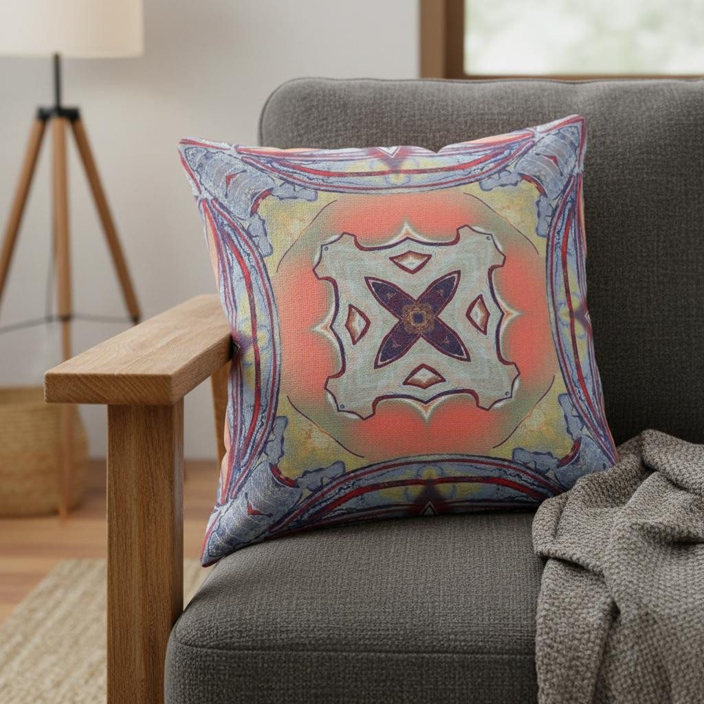 Embracing a folksy pattern in traditional colors, this Purple Orange Geo Tribal Suede Throw Pillow exudes a blend of bohemian and tribal aura with a modern flair. The pastel palette brimming with tones of blue, purple and orange cascade into a circular tribal motif at the center creating a subtle contrast. Crafted from leather-like suede fabric for ultimate softness and durability that gives this pillow a luxurious look and feel. This blown and closed pillow comes with a high-quality polyfill insert that makes the pillow super soft and fluffy for a comfortable resting experience. This tribal-inspired pillow will serve as a stunning piece of décor in your living room and complement the aesthetics of any boho-chic ensemble. 18” x 18” x 5”