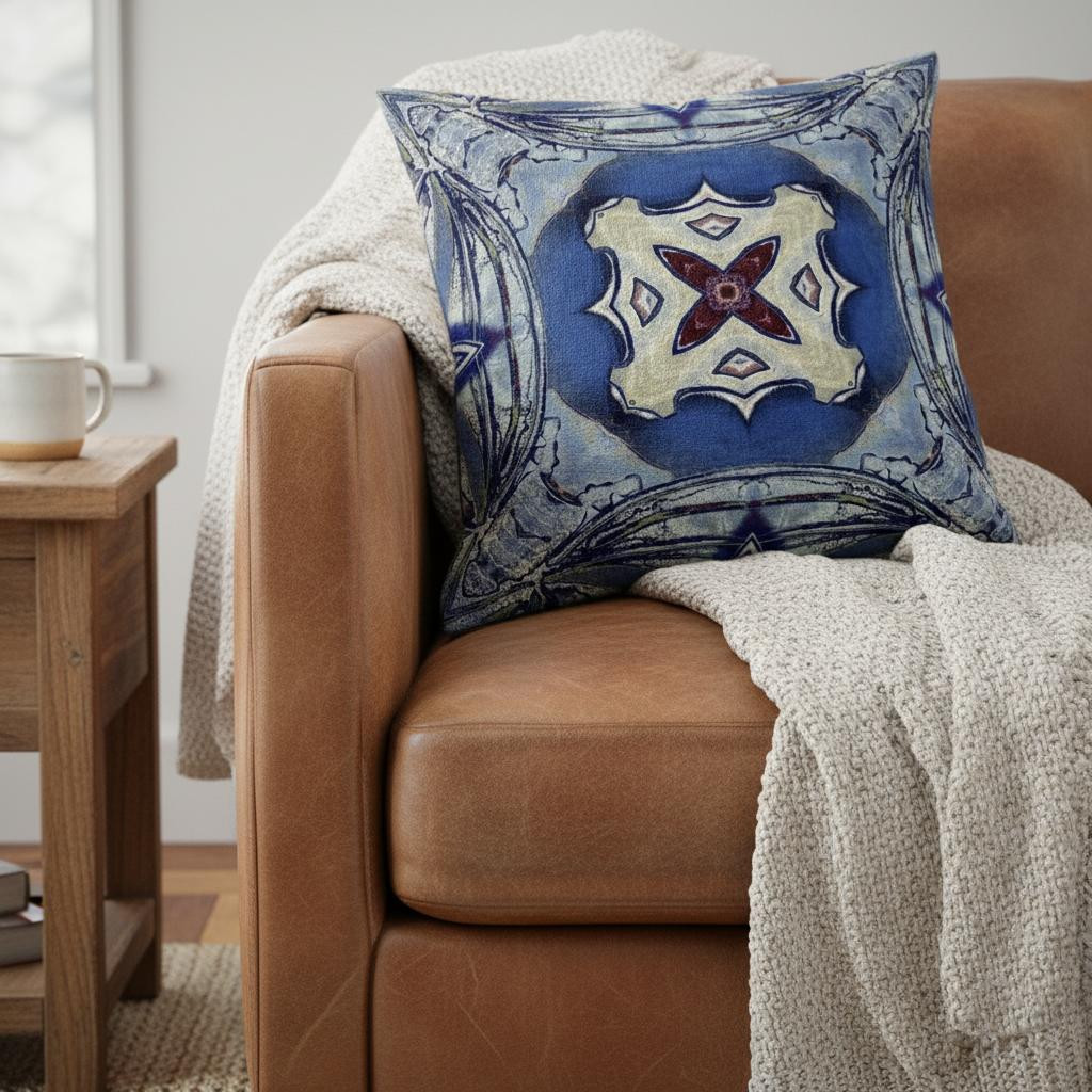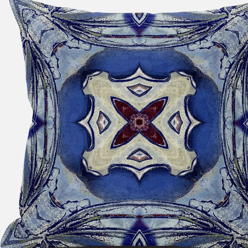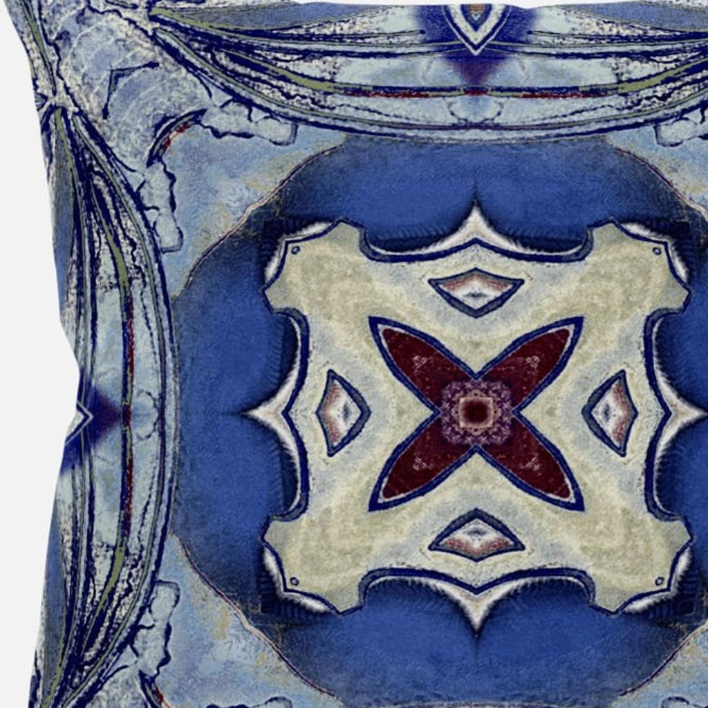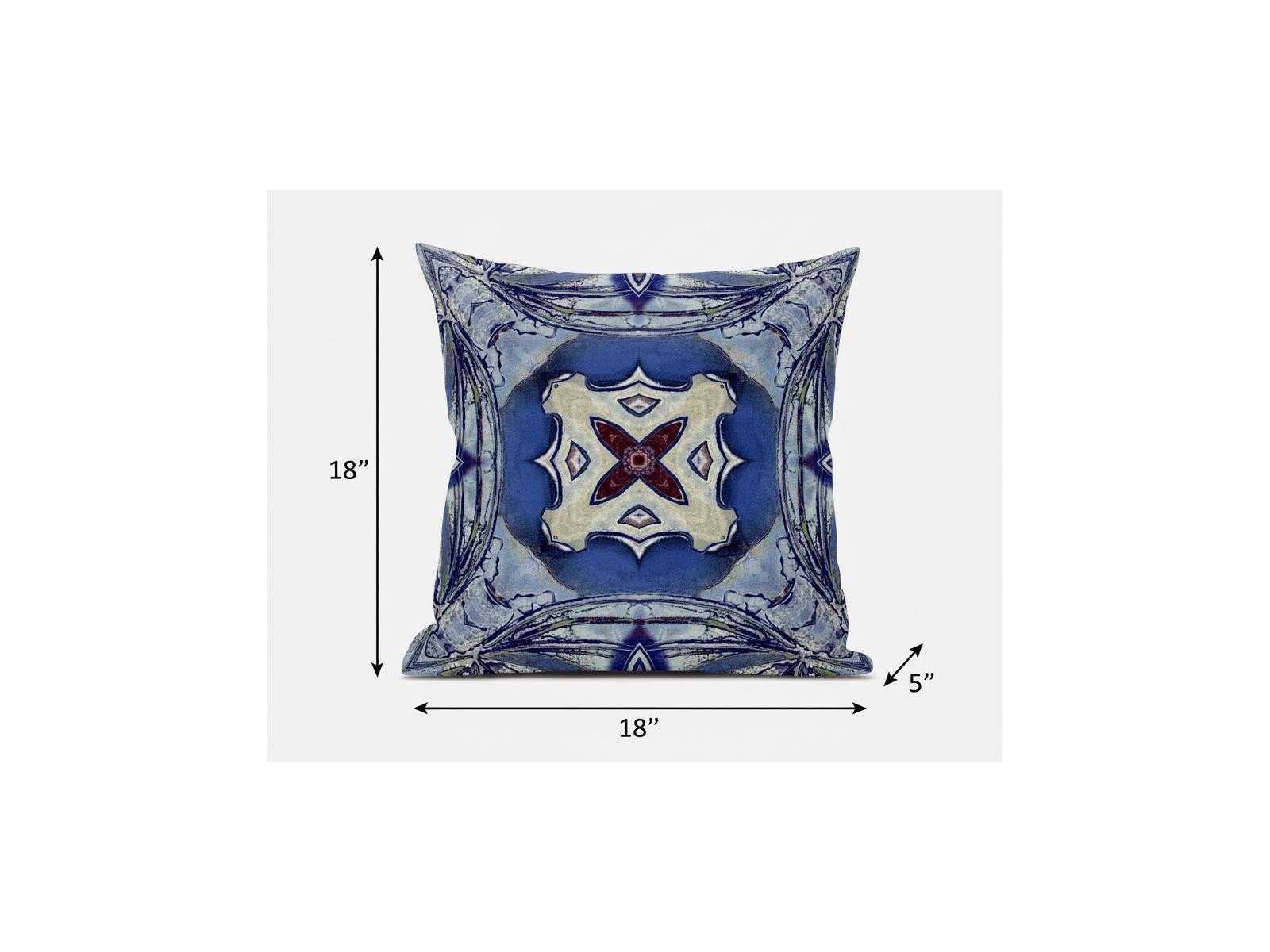 Combining timeless patterns with vivid colors this exquisite Blue Cream Geo Tribal Suede Throw Pillow will elevate your boho aesthetic and evoke an uplifting sensation in the room. Brimming with swirls of blue, the decorative pillow features a cream-colored center ring and a red floral patch encircled in it which give the pillow a refreshing allure. Made to experience a sense of luxury, this pillow is crafted from the robust yet soft-to-the-touch suede fabric that is known for its appealing look and texture. This blown pillow features a high-quality polyfill insert from optimum comfort while making the piece super fluffy for a luxurious feel on the touch. Complement your modern décor with an element of freshness by adding this beachy boho throw pillow that can spruce up the room in an instant. 18” x 18” x 5”