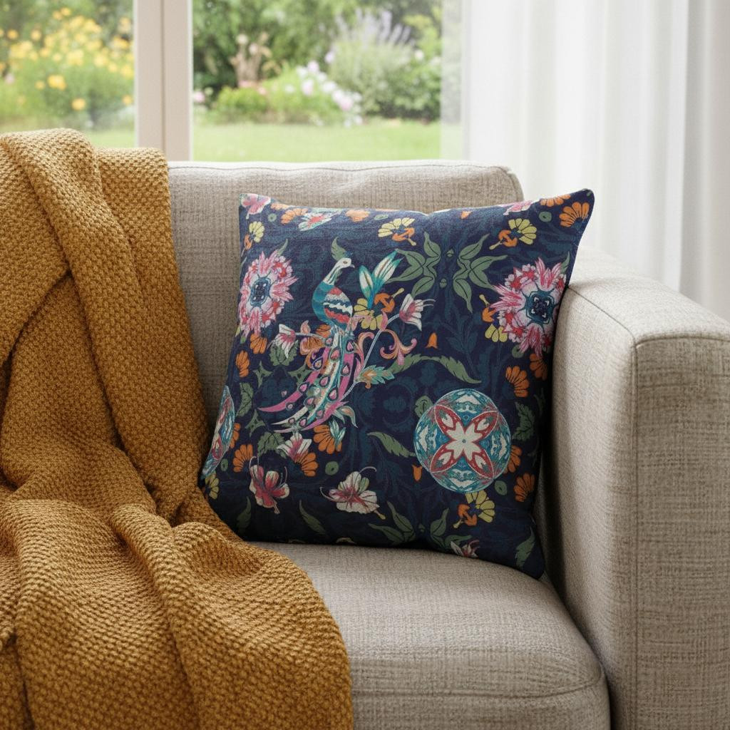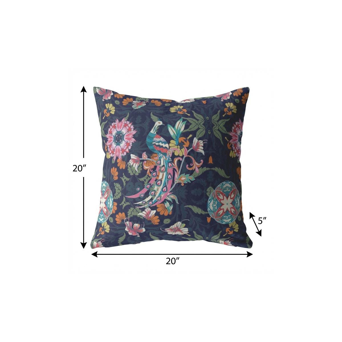 Balancing between patterns and palette with perfection, this Navy Pink Peacock Suede Throw Pillow will be an element of traditional charm and modern grace in your living room. The fuchsia pink, cyan, and sage-toned floral filigree teeming over a navy blue background with pops of orange and yellow to create a stunning piece of art for visual allure. Made from superior grade suede for a durable structure and premium feel, it's the perfect accent for adding a velvety appeal to your indoor settings. This blown pillow is filled with a durable polyfill insert for a soft and fluffy nature, providing maximum comfort when you lean on it. Bring home this eye-catching decorative pillow that will enhance the aesthetics of your living space with its cool and warm-toned hues. 20” x 20” x 5”