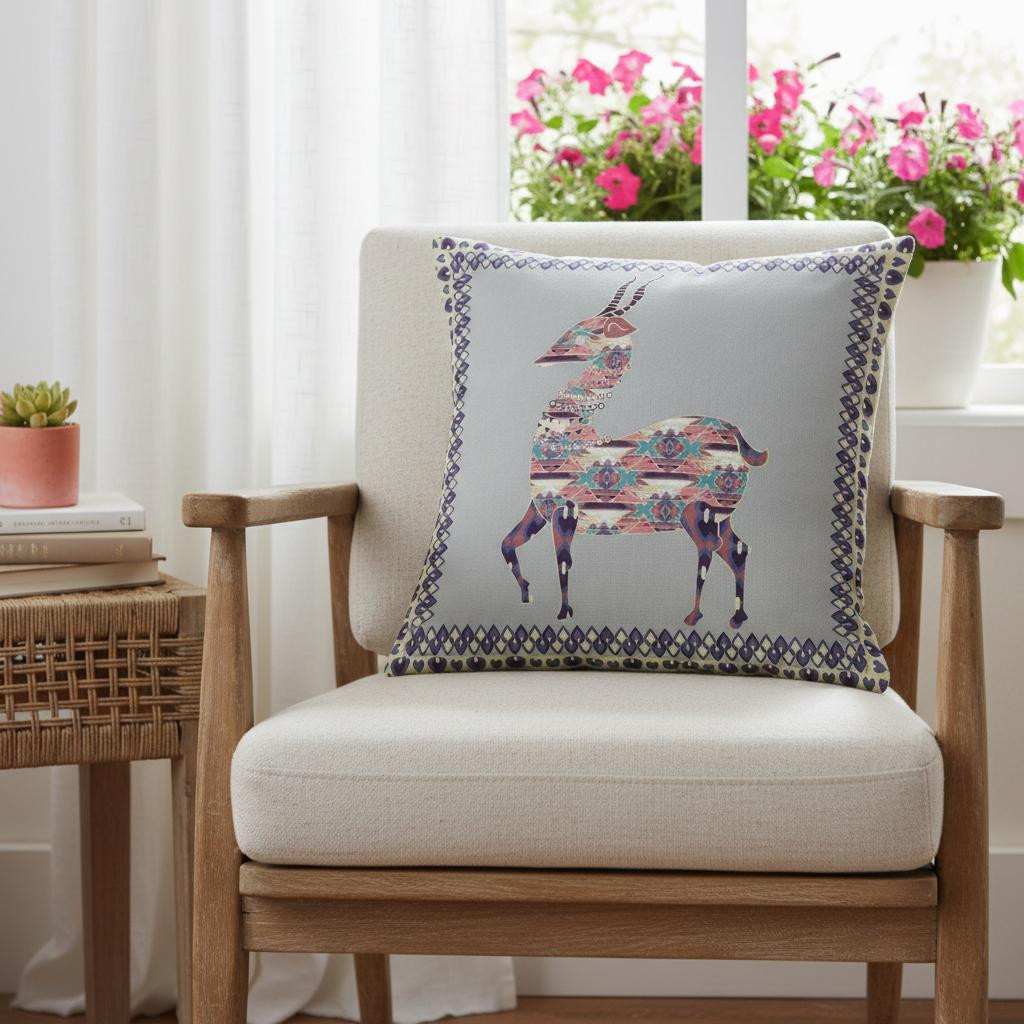 Adorn your home with this boho-inspired Purple Cream Boho Deer Suede Throw Pillow that will stand out as a traditional eye-catching accent in your living room. An intricate illustration of a deer in shades of pink and purple geometric embellishments is emphasized on a soft lavender-gray background with traditional detailings around the edges for visual intrigue. The premium quality suede fabric gives this pillow a lavish appearance with a silky smooth finish while ensuring durability for long-term everyday use. This blown and closed throw pillow features a soft polyfill insert which makes this eco-friendly pillow luxuriously fluffy and super comfortable to support your posture when you lean on it. The graceful visual of this decorative throw pillow is sure to complement the aesthetics of any modern or boho-chic home. 16” x 16” x 5”