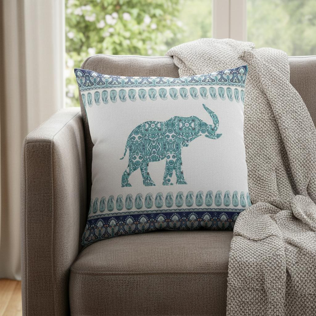 Immerse your home in the soothing colors of this Teal Ornate Elephant Suede Throw Pillow that is sure to bring a touch of boho-chic into your living room. The relaxing blue and teal tones of this decorative pillow mesh perfectly with the captivating elephant print in the center and the icy white background brings it together to give this pillow an enthralling bohemian visual. Made from high-quality suede fabric for enhanced durability and softness with a soft and smooth surface texture that feels luxurious on the touch. This pillow is blown and closed with a durable polyfill insert which gives the piece a plush and fluffy look, making it ideal for resting or sleeping with utmost comfort. The intricate print and bright colors of this decorative pillow make it the personification of boho and it is sure to add an alluring and calm visual to your home. 16” x 16” x 5”