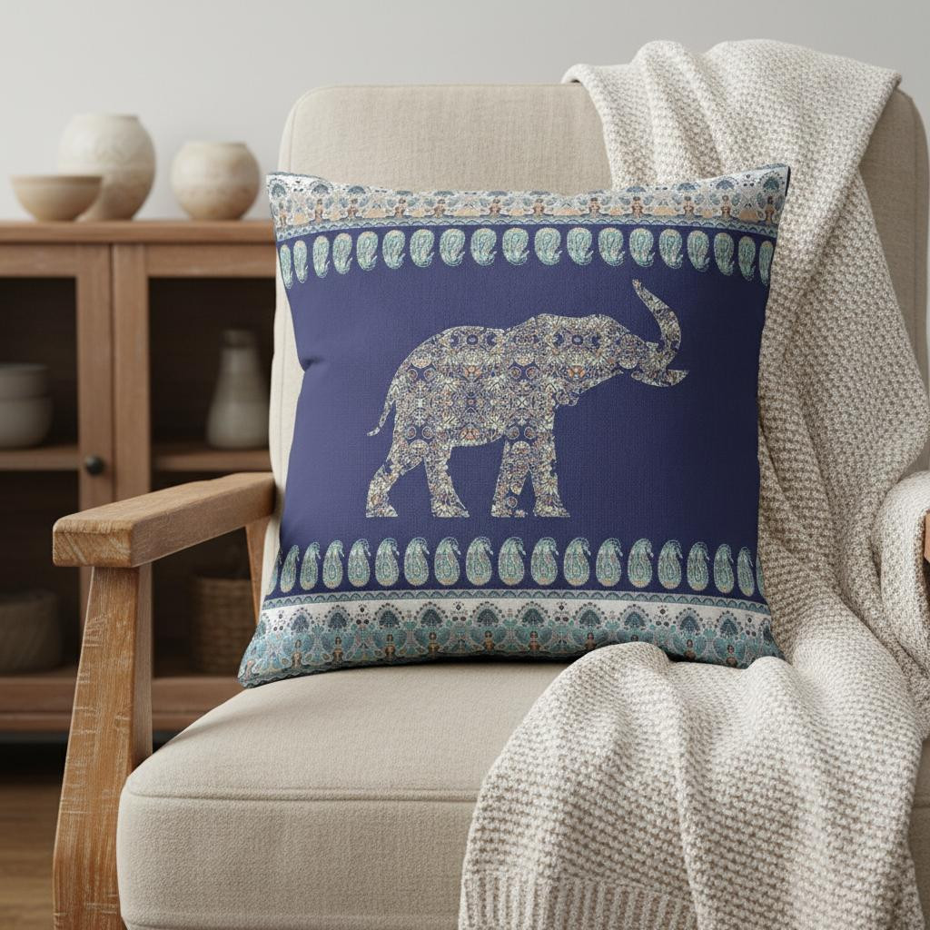 Embracing the cool-toned hues of the spectrum with alluring patterns, this Navy Ornate Elephant Suede Throw Pillow will make a bohemian statement into your modern home. The elegantly printed decorative elephant in eclectic shades of soft blue, yellow, and white looks stunning over the navy blue base, while the paisley patterns and embellishments on the sides create an awe-inspiring boho aesthetic. Skilfully crafted from high-quality suede fabric which is known for its durability and smooth surface texture that feels as luxurious as it looks with a subtle shine. This blown and closed pillow comes with a durable polyfill insert to give the piece a plush and premium feel with added fluffiness that makes this piece an element of beauty and comfort. Bold and beautiful in its visual elements, this decorative pillow is sure to give your living room a classic bohemian update. 18” x 18” x 5”