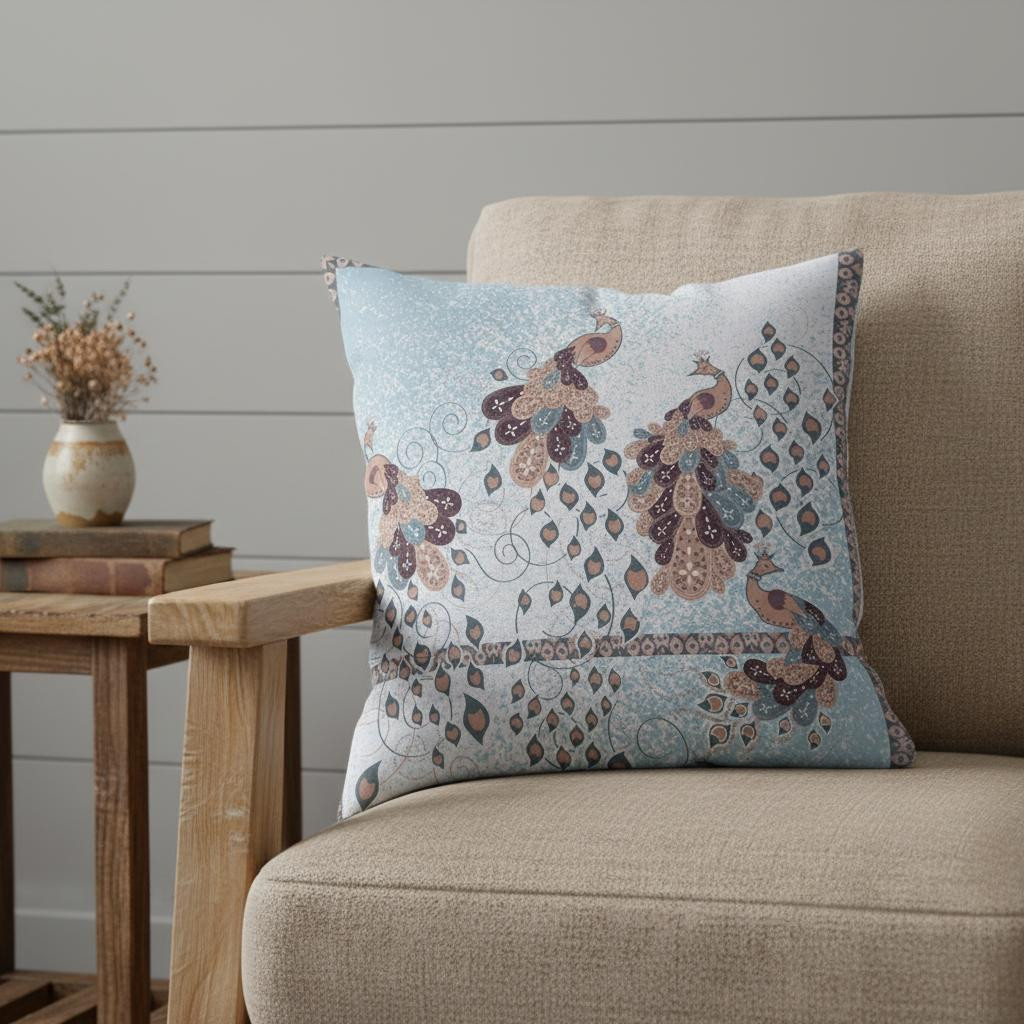 Combining modern colors with traditional boho-chic patterns, this stunning Blue Brown Boho Bird Suede Throw Pillow will be a stunning decorative accent for your contemporary or bohemian living room. The alluring transition of soft blue and white base serves as a perfect foundation to flaunt the uniquely designed peacock illustration in shades of brown that is sure to grab attention. The silky smooth and durable suede fabric gives the piece an appealing texture while ensuring enhanced durability to serve you for years. This blown and closed pillow is finished to perfection with a soft and durable polyfill insert for a fluffy appearance. Achieve a calm yet playful ambiance into your living space with this stunning decorative pillow paired with your modern sofa or couch. 18” x 18” x 5”