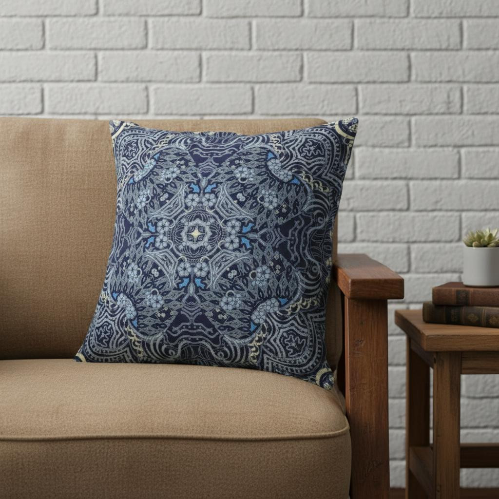 Turn your living room into a shrine of peaceful remedy with this one-of-a-kind Indigo Boho Ornate Suede Throw Pillow. Made to be the embodiment of bohemian bliss, it entails strikingly detailed visuals in indigo and dove gray. The delicate drape in suede fabric not only gives this pillow a luxuriously smooth finish with a lustrous appearance but also ensures durability to last for a long time while being easy to maintain. This pillow is blown and filled with a soft polyfill insert for a plush and fluffy look, making it an excellent accent of comfort when placed on the sofa, chair, or bed. Bring home an accent of pleasing delight with this alluring throw pillow to spruce up your bohemian home. 18” x 18” x 5”
