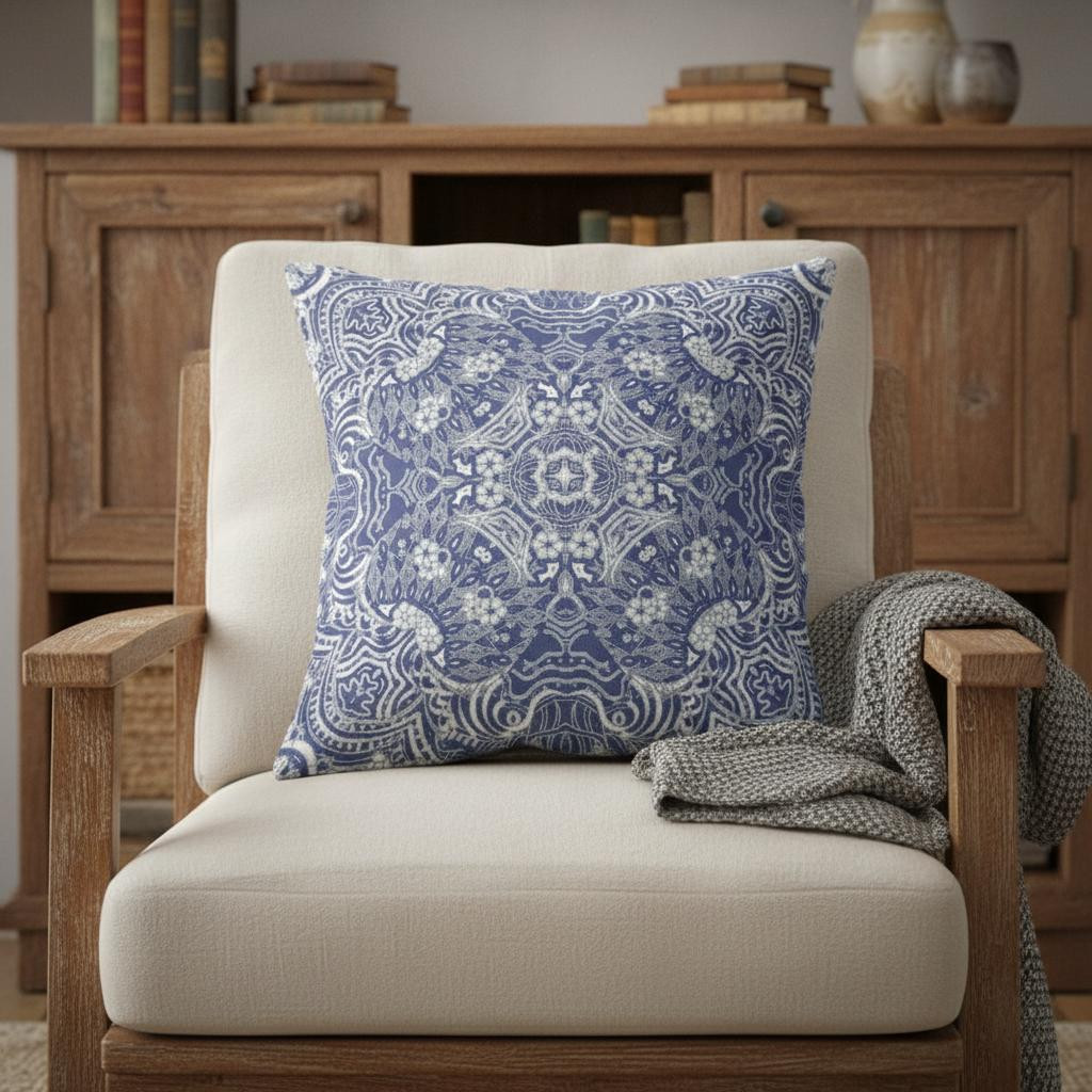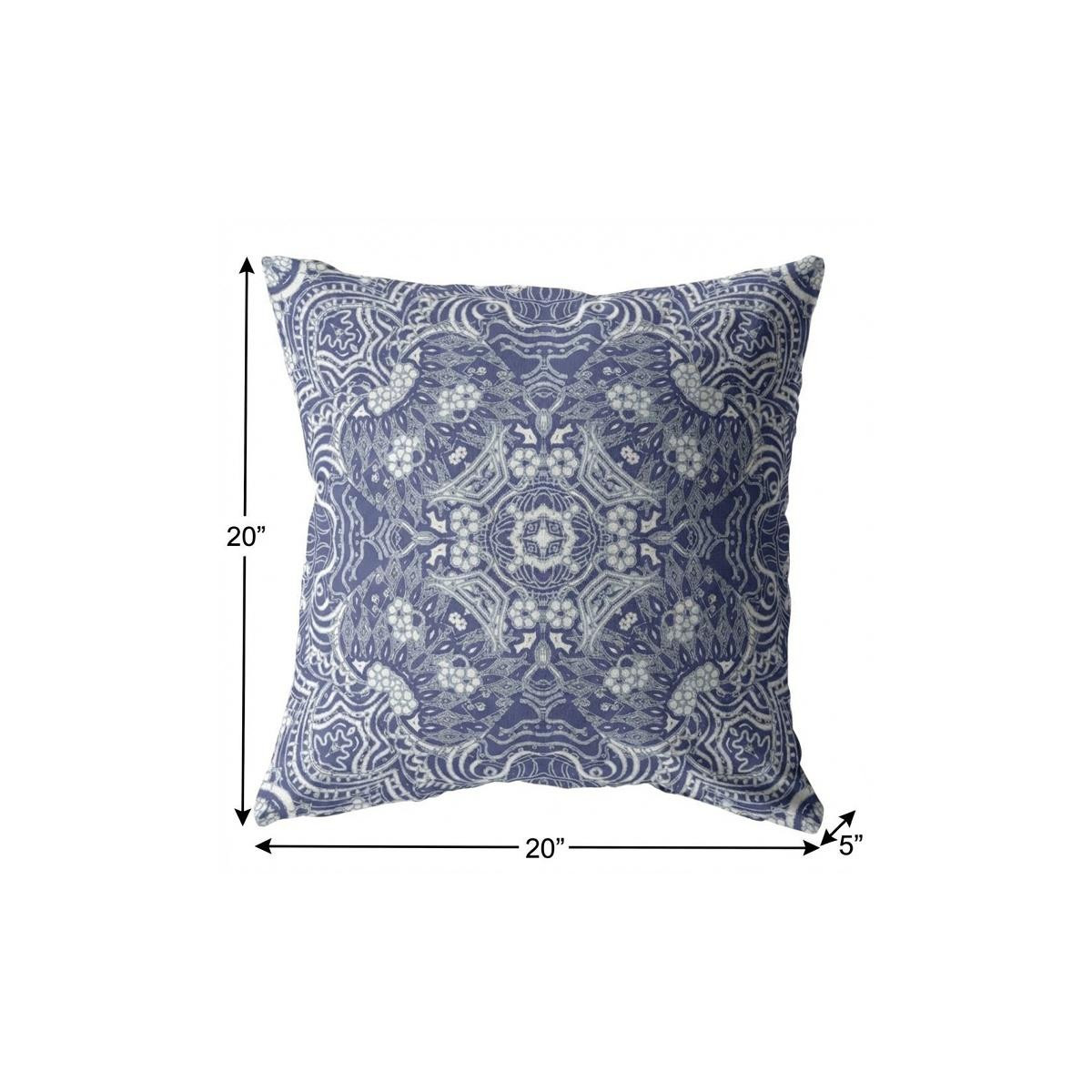 Bring a blissful bohemian aesthetic into your living room with this Indigo White Boho Ornate Suede Throw Pillow. The intricate decorative detailing in white and gray beautifully complements the soft indigo base, creating a calm yet captivating visual appeal. Crafted from a luxurious suede fabric, the pillow has a premium look and feel while also being very durable. This blown and closed throw pillow features a soft polyfill insert which makes this eco-friendly pillow luxuriously fluffy and super comfortable to support your posture when you lean on it. Set an inviting tone into your home with this cool-toned decorative pillow that will effortlessly blend in with a wide variety of interior decors. 20” x 20” x 5”