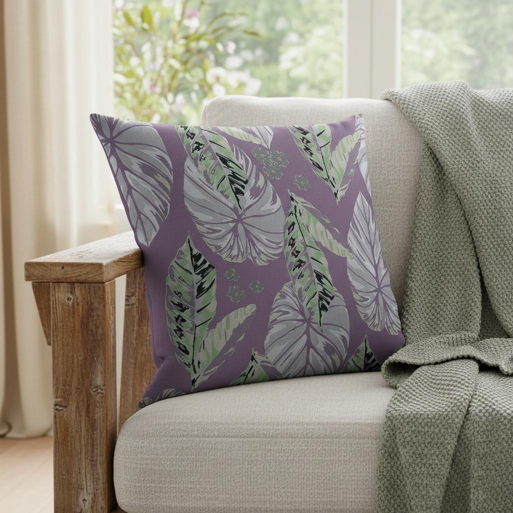 tropical leaf suede throw pillow, leaf suede throw pillow, 18 white purple tropical leaf, purple tropical leaf suede throw, white purple tropical leaf suede |