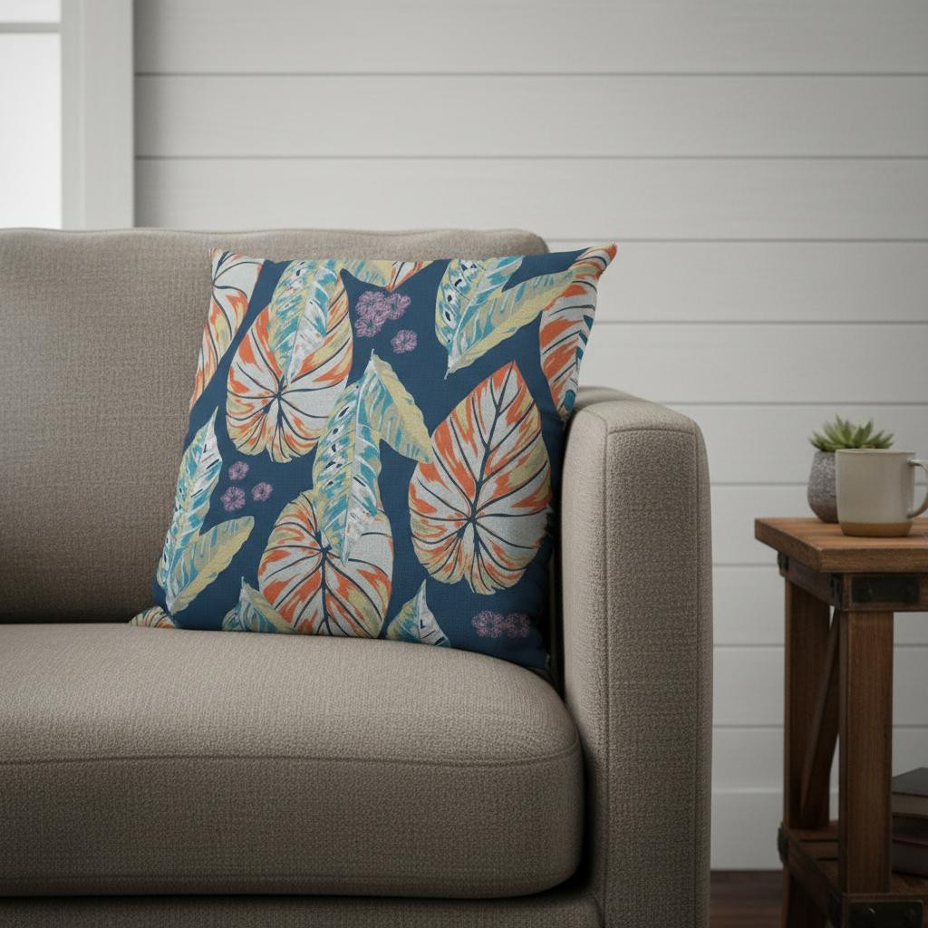 tropical leaf suede throw pillow, leaf suede throw pillow, 18 orange blue tropical leaf, orange blue tropical leaf suede, blue tropical leaf suede throw |